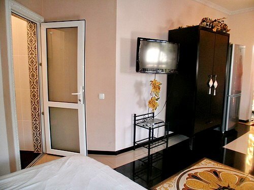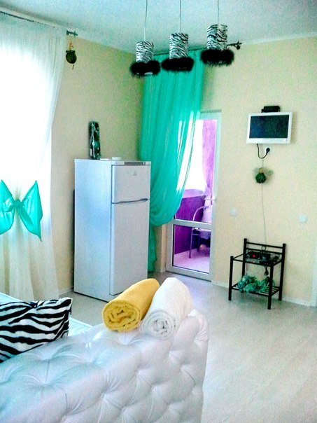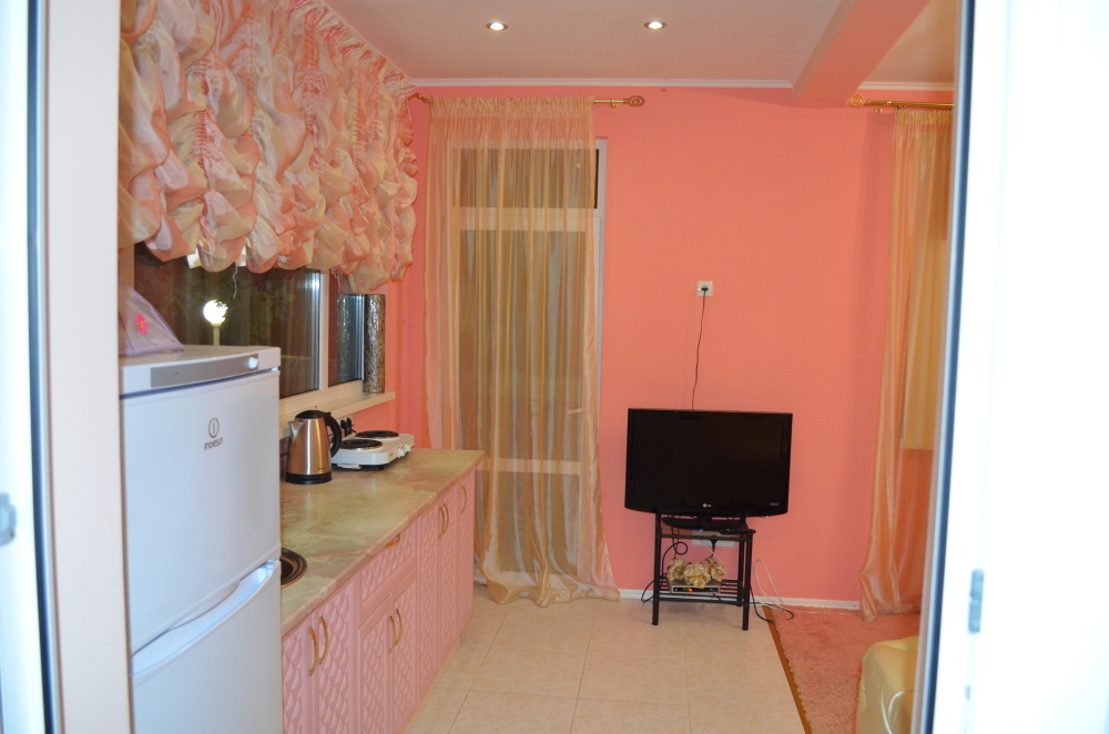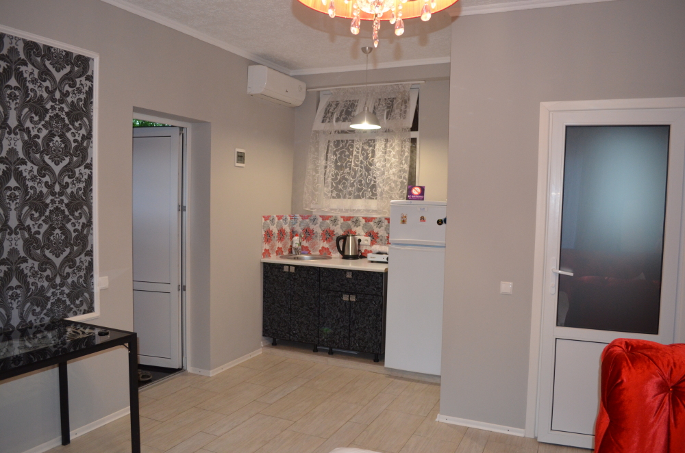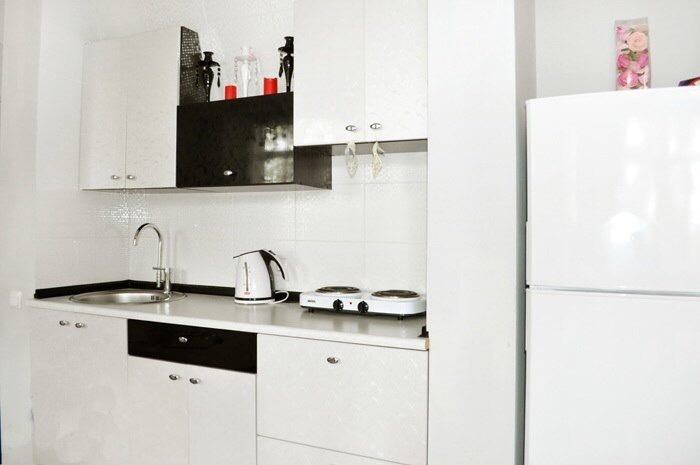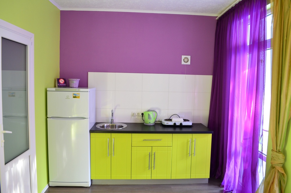 В каждом номере есть небольшая кухня, полноценный холодильник, электрическая плита, чайник, посуда.