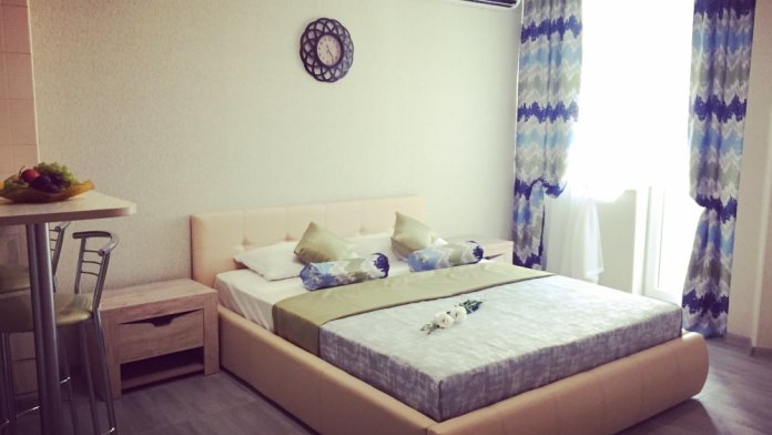 Вашему вниманию предлагается квартира-студия после ремонта, которая может вместить до 3 человек. В большой комнате-студио находится кухня, стол, телевизор и большая удобная двуспальная кровать.