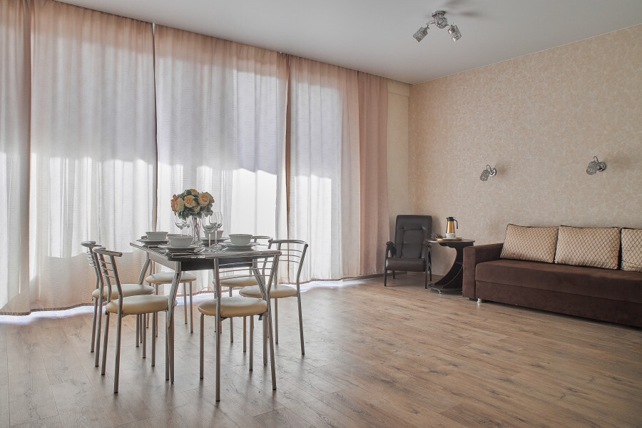 На территории комплекса имеется подземная охраняемая парковка (300 руб./сутки). На первом этаже комплекса расположено кафе, в котором можно заказать доставку в апартаменты, так же в шаговой доступности есть ресторан.