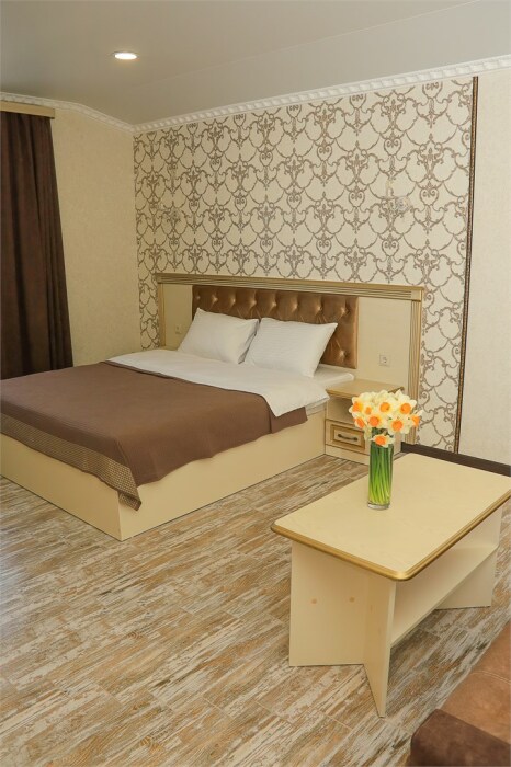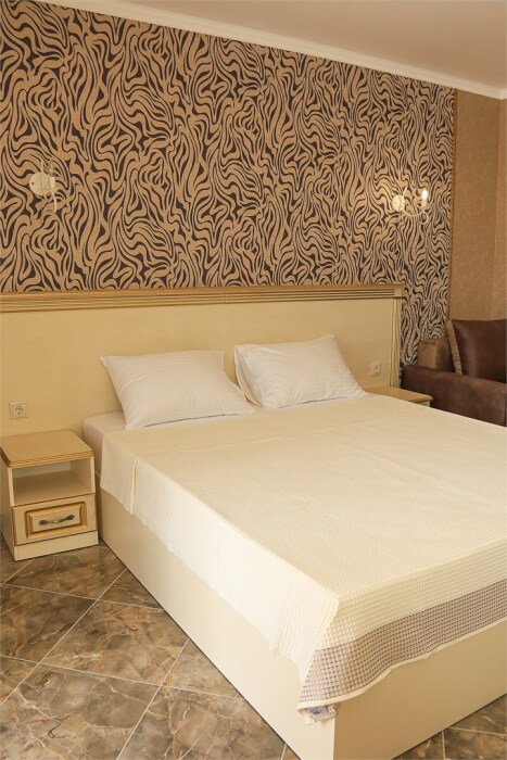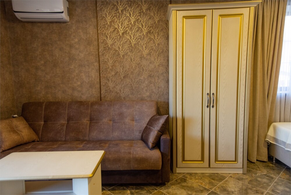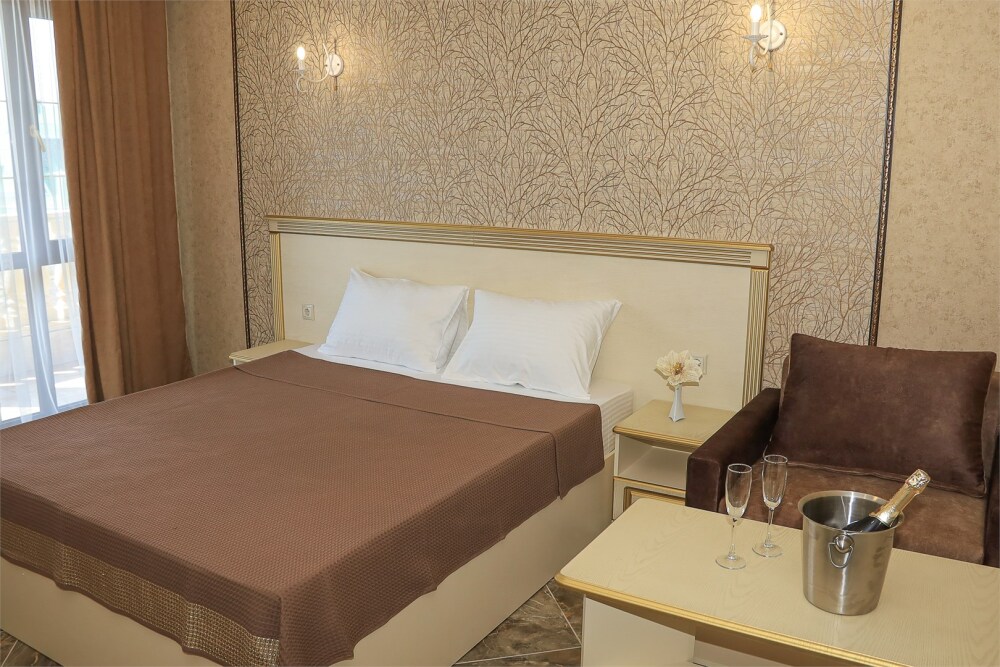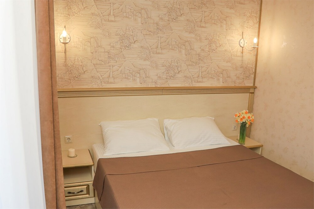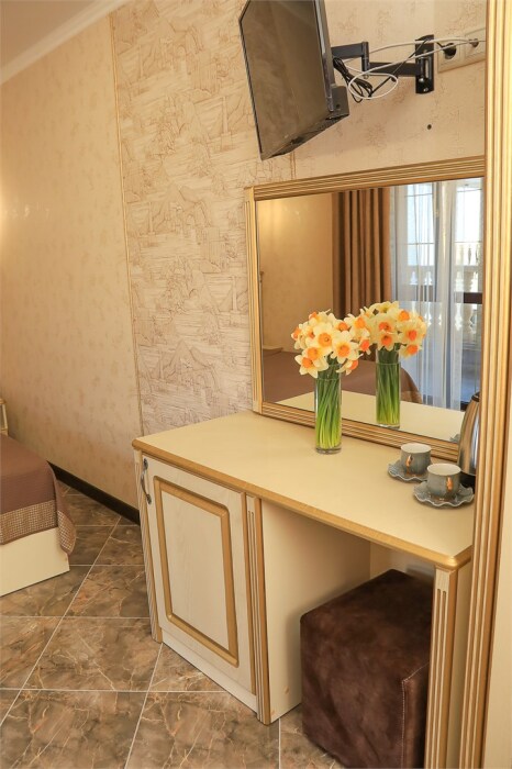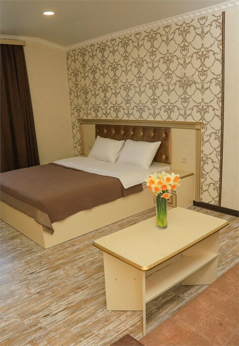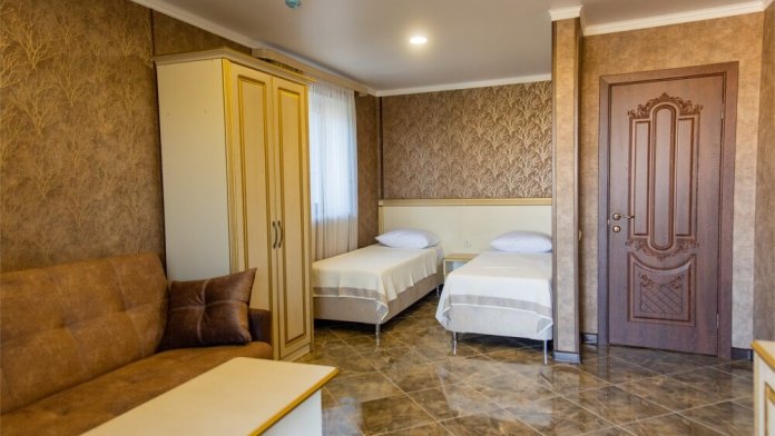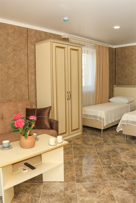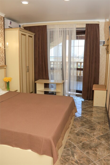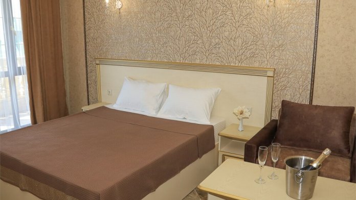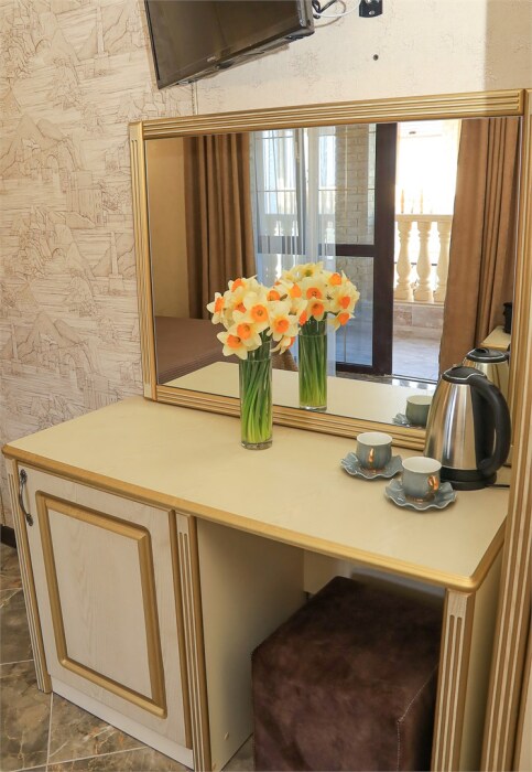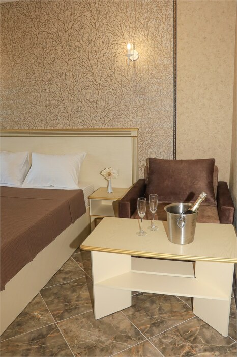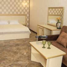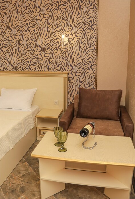 Уютный номер для 1–2 человек, площадью от 20 до 24 м². В комнате: большая кровать, рабочая зона, телевизор, чайник, шкаф. В ванной — душ, фен, туалет, полотенца. Есть кондиционер, Wi-Fi. На этаже — утюг и гладильная доска. Стойка регистрации работает круглосуточно. Уборка — раз в 3 дня, смена белья — раз в 5 дней. Завтрак с 8:00 до 10:00 (дополнительно). В ресторане действует дневное меню. Бесплатно: прачечная, хранение багажа, парковка. Сувениры из Крыма на территории. Дети до 3 лет — бесплатно.