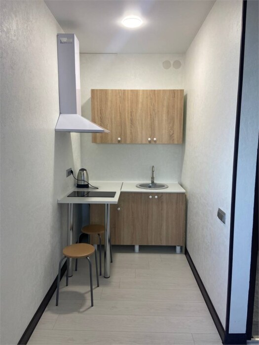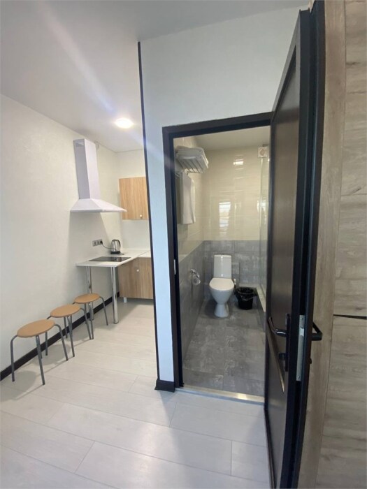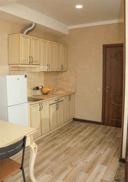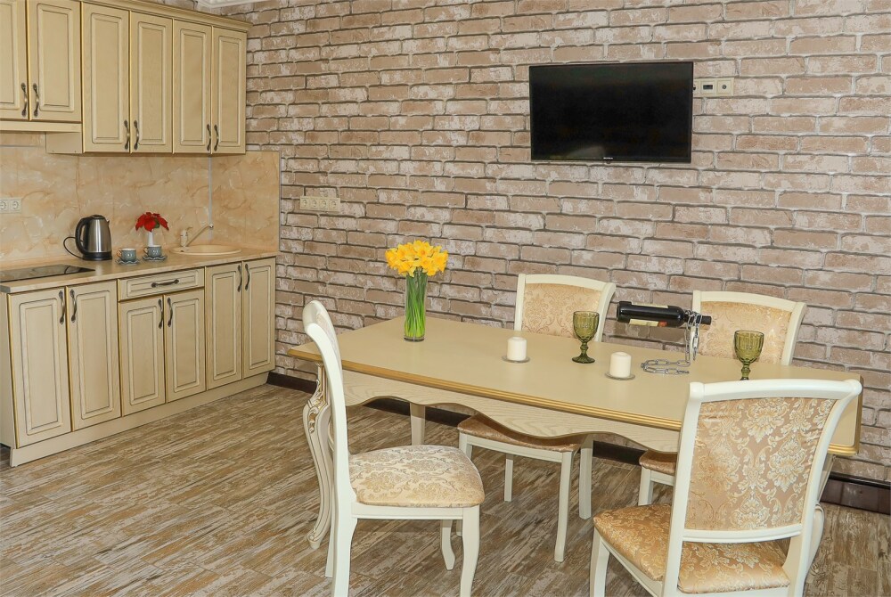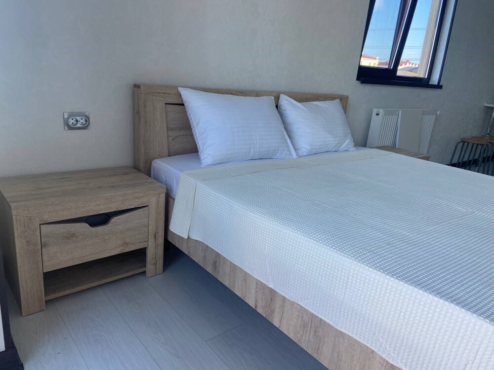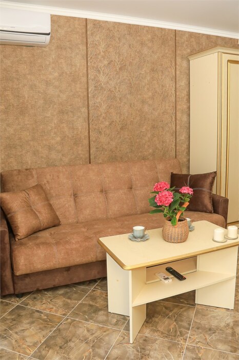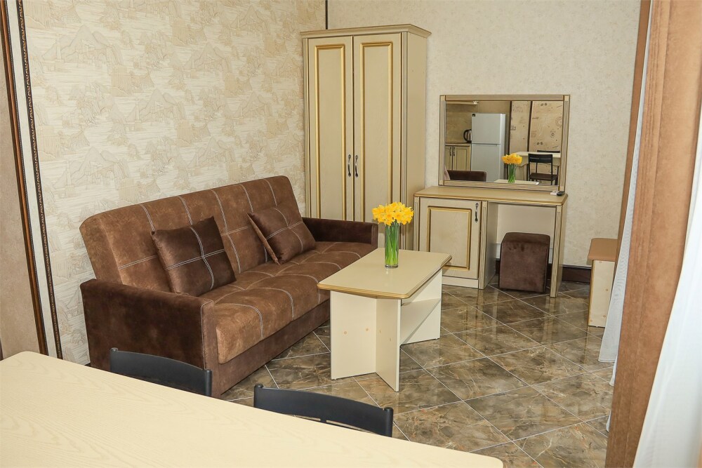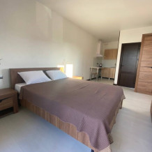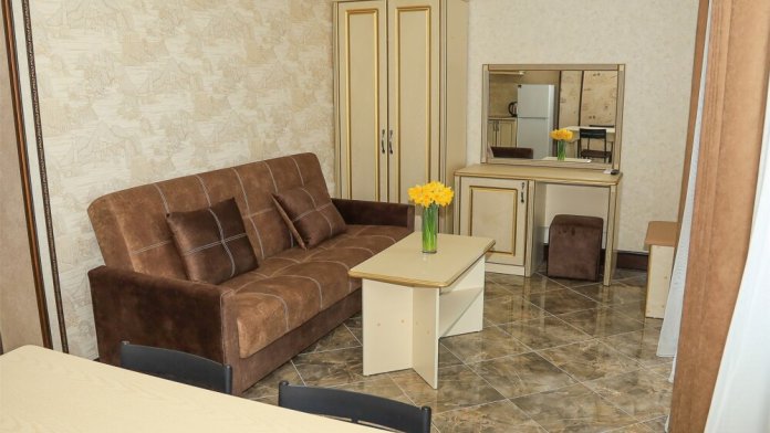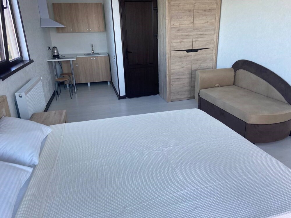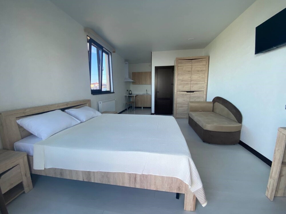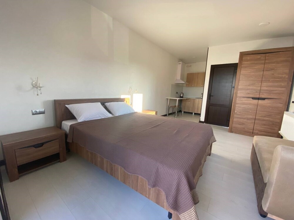 Уютная студия для 2–3 человек, площадью 20–30 м2. В номере: большая кровать, раскладное кресло, кухня с посудой, холодильник, чайник, обеденная зона, телевизор, шкаф. В ванной — душ, фен, санузел, полотенца. Есть кондиционер, бесплатный Wi‑Fi. Утюг и гладильная доска — на этаже.