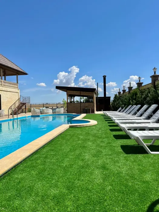 Парковка и гостевой дом находится под круглосуточным видеонаблюдением. На территории имеется собственный открытый бассейн с подогревом, рядом расположен контактный бар, широкая терраса для отдыха и принятия загара, игровая площадка для детей, кафе, лаунж бар с панорамным видом, кальянная.