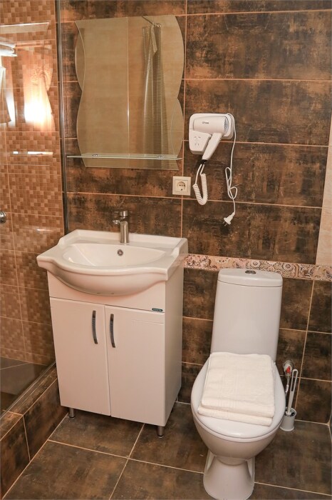 Однокомнатный улучшенный номер для 2–4 человек. В номере: большая кровать, раскладной диван, рабочая зона, чайник, телевизор, шкаф. В ванной — душ, фен, туалет, полотенца. Есть кондиционер и бесплатный Wi‑Fi. Утюг с гладильной доской — на этаже. Один ребёнок до 6 лет — можно без отдельного спального места.