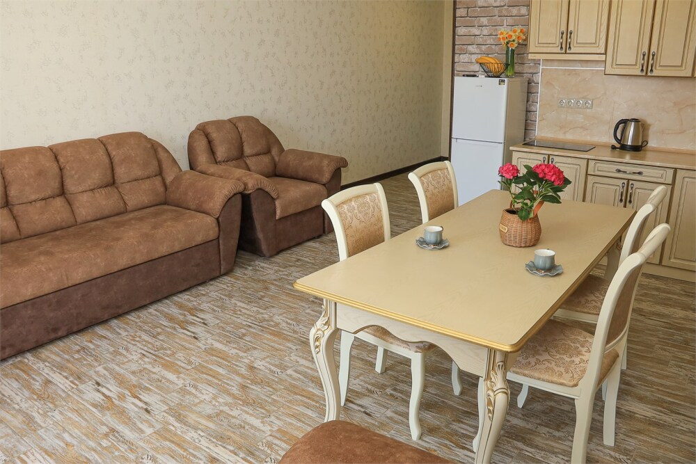 Просторный VIP-номер с отдельной спальней и гостиной с кухонной зоной. Идеален для семьи из 2–4 человек. В номере: большая кровать, 2 раскладных дивана, кухня, обеденная зона, посуда, холодильник, чайник, телевизор. В ванной — ванна, фен, санузел, полотенца. Кондиционер, Wi‑Fi.
