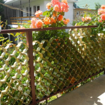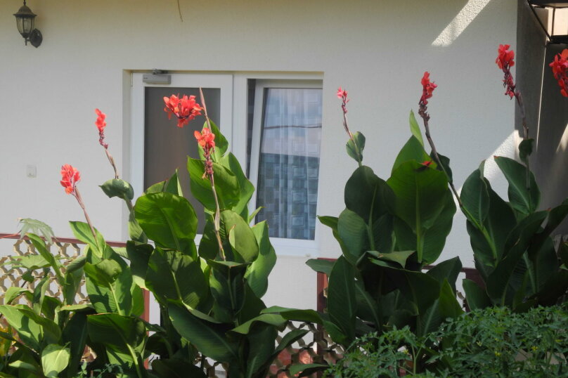 Закрытый зелёный двор с множеством цветов и мест для отдыха, мангал, просторная кухня общего пользования и общая беседка-столовая.