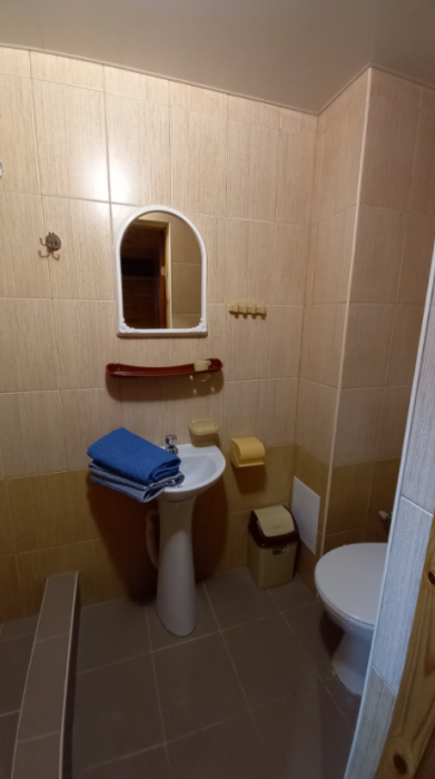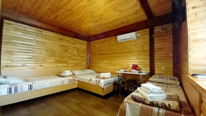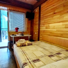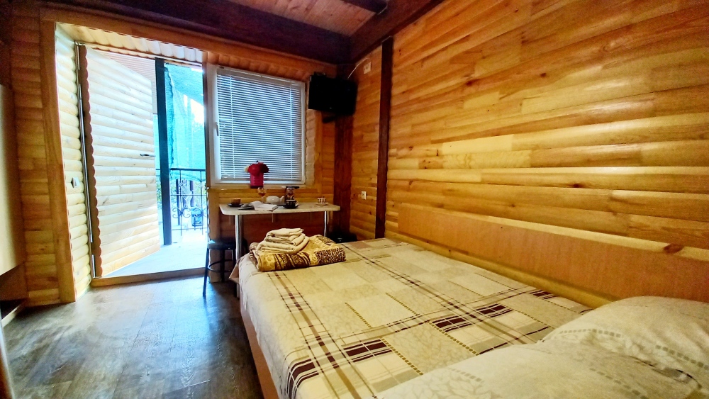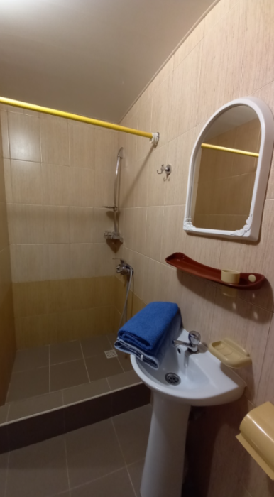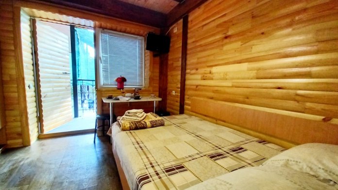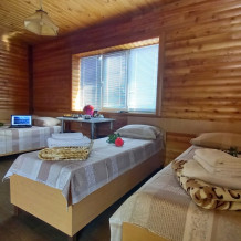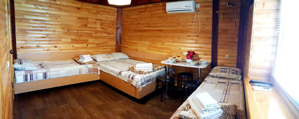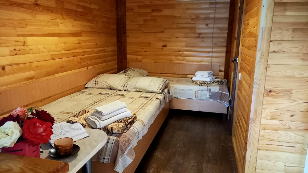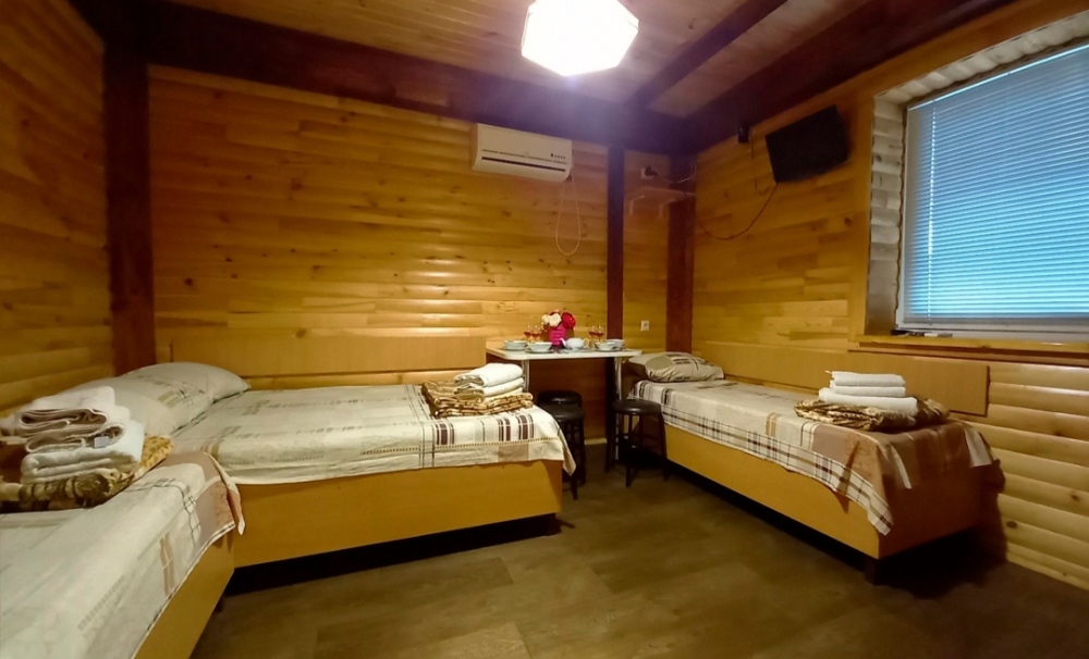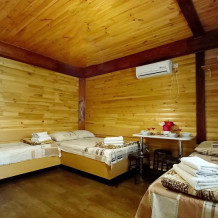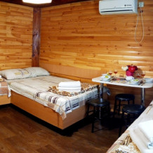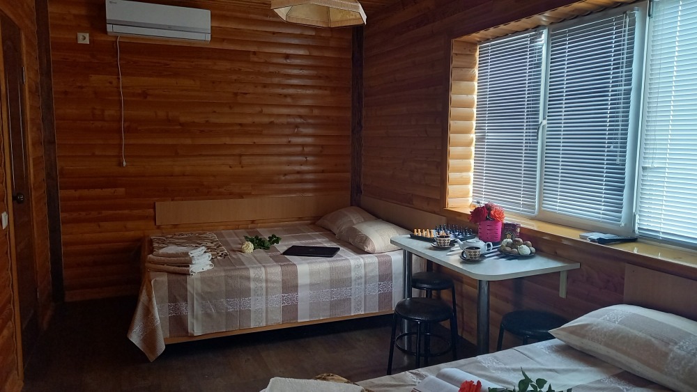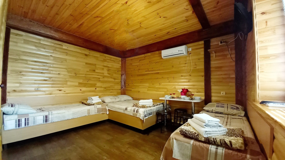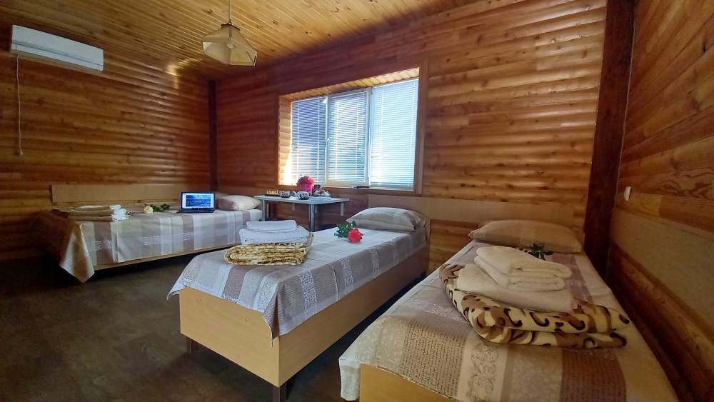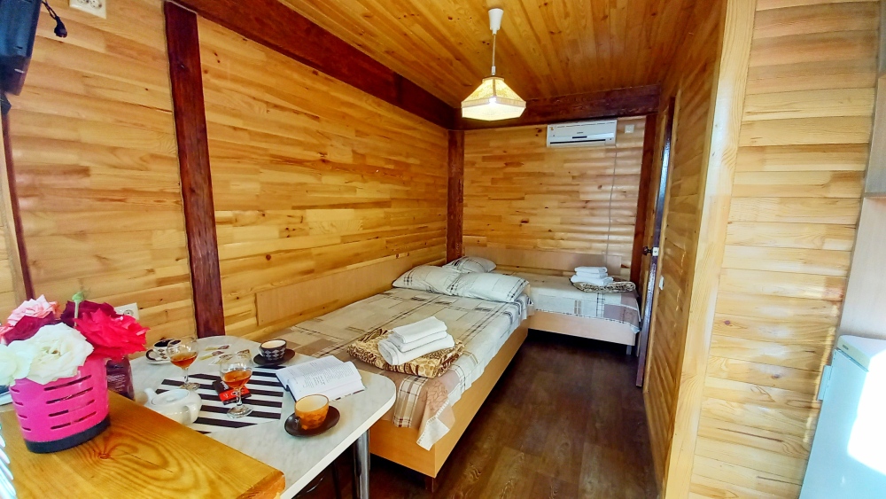Номер подойдёт как для размещения вдвоем, так и для семьи с ребенком. В номере полуторная и односпальная кровати. Санузел в номере, холодильник, тв, интернет, кондиционер, посуда.