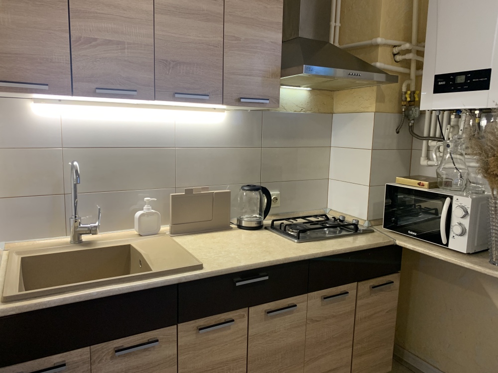 - На кухне полный набор посуды, газовая плита, микроволновка, холодильник, телевизор, обеденная группа.