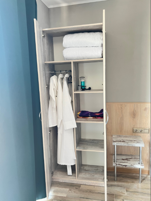 В номере: двуспальная кровать с ортопедическим матрацом, качественное постельное белье, большой телевизор, цифровое TV, шторы блэкаут, халаты, пляжные полотенца, отпариватель для одежды, кондиционер, холодильник, чайник. В ванной комнате: душ, гигиенический душ, косметические средства: шампунь, гель для душа, мыло, фен. Для детей: халатик, отдельная односпальная кровать, детское средство для купания: шампунь, гель для душа, мыло, ступенька для умывальника.