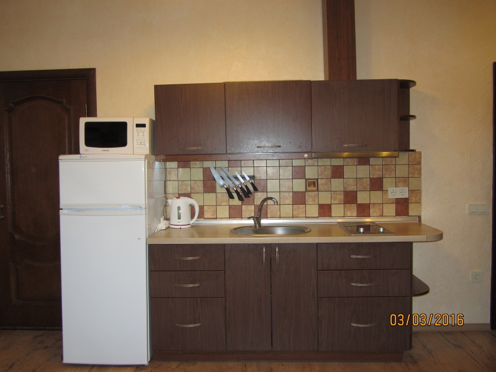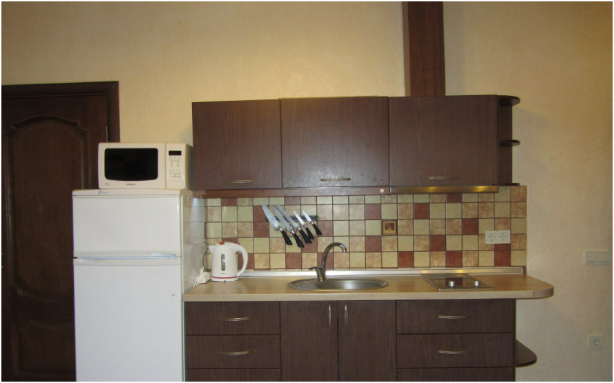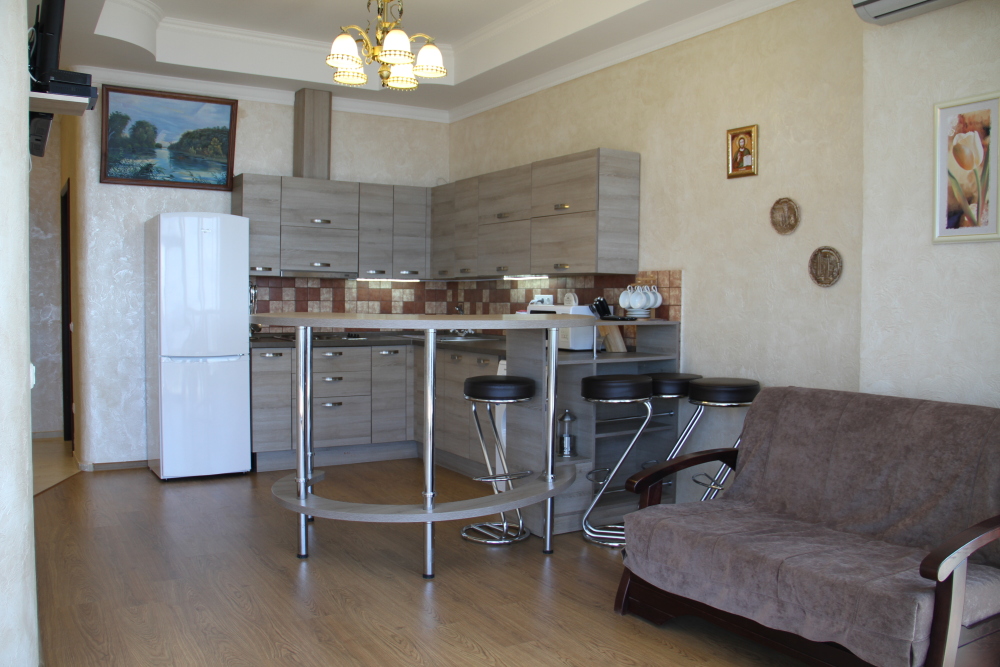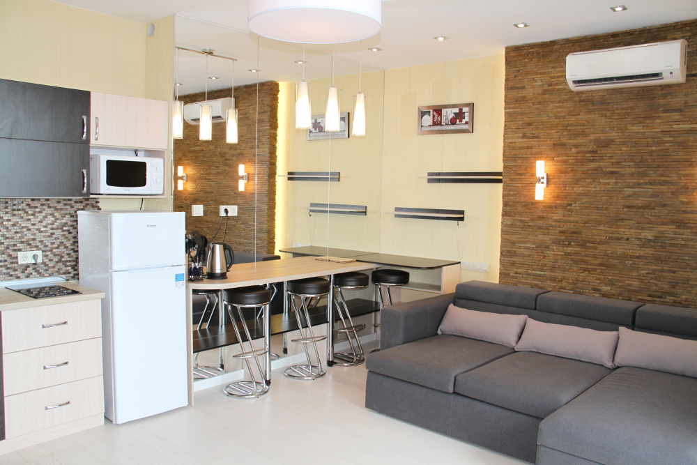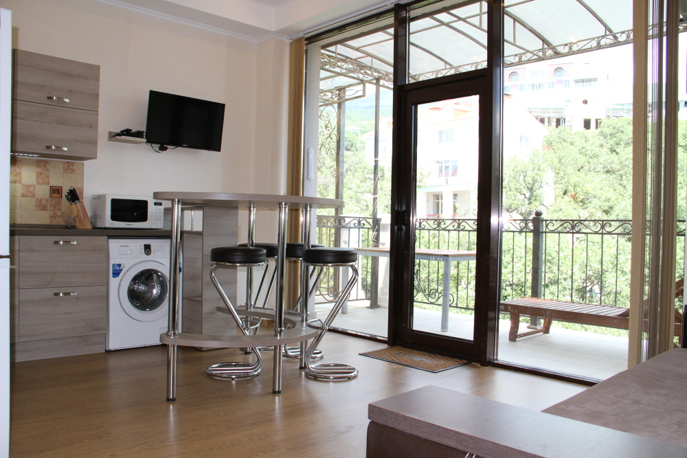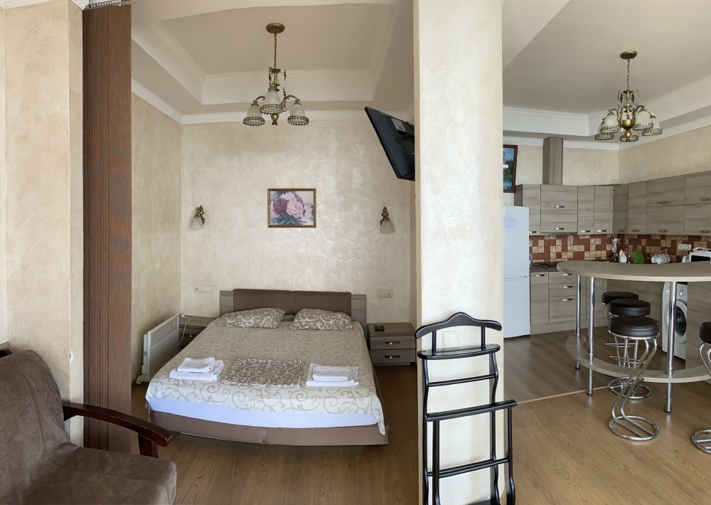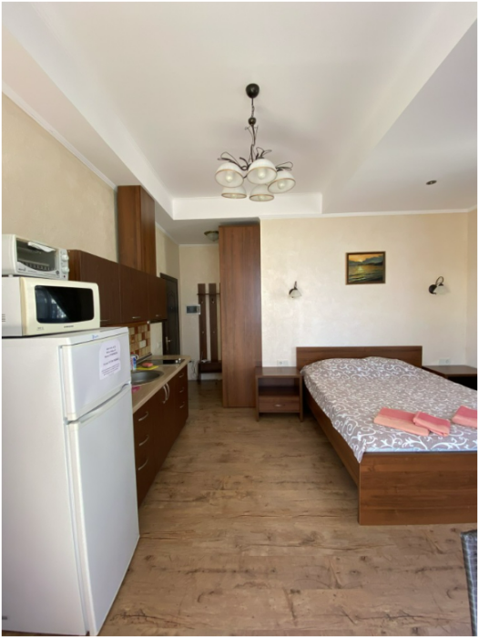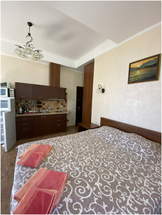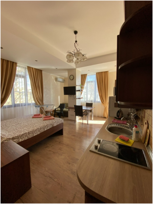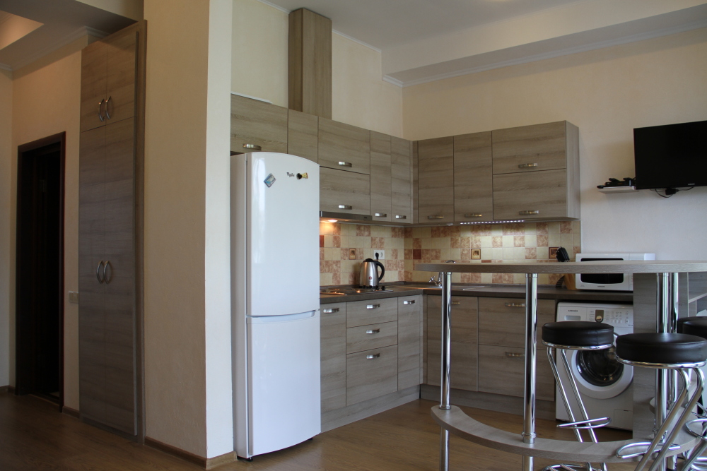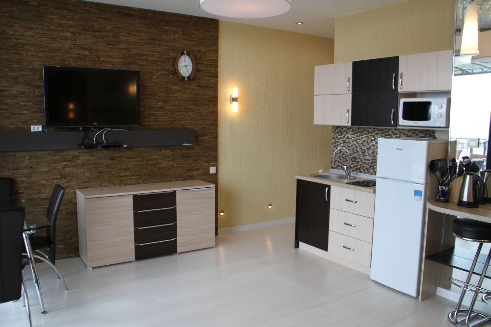 Апартамент-студия для размещения семьи из трех человек. Полноценная кухонная зона со всем необходимым оборудованием.