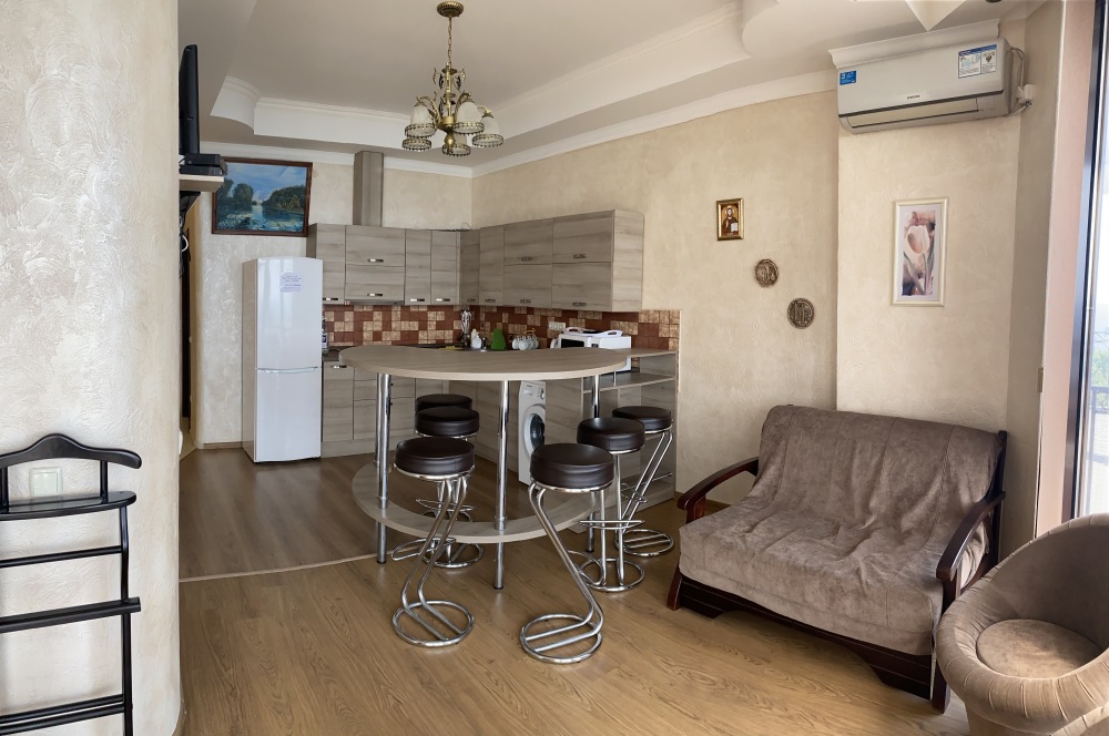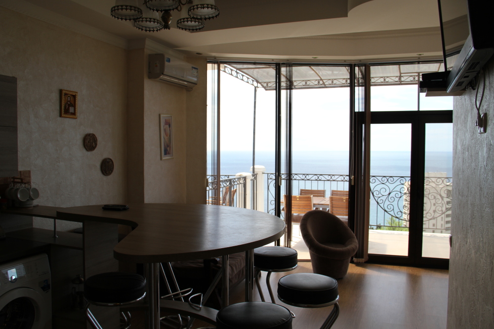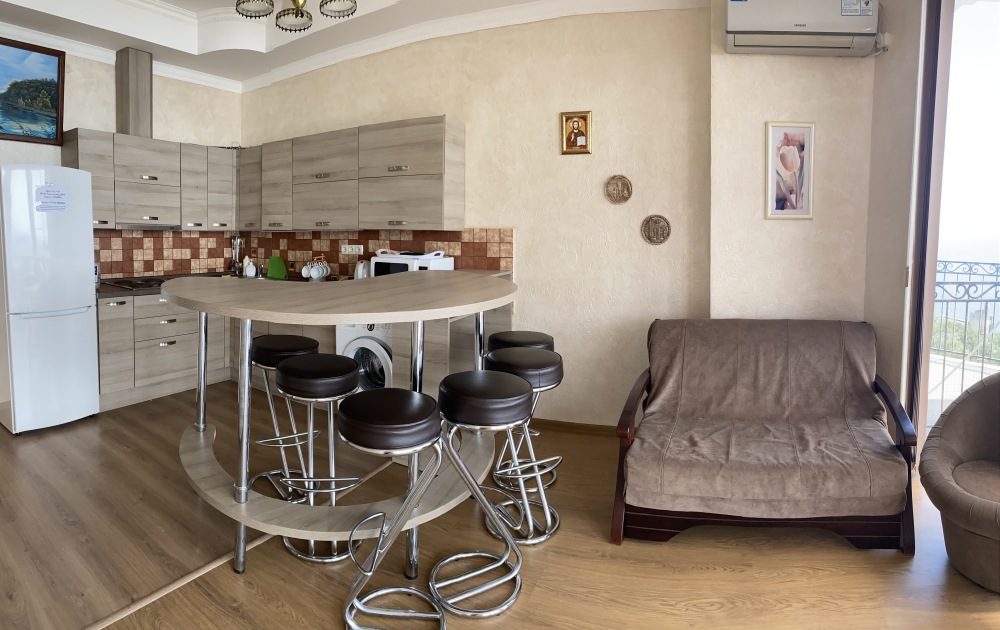 Апартамент-студио с прямым видом на море на 6-м этаже. Кухонная зона оборудована всем необходимым. Бронирование от 2 ночей.