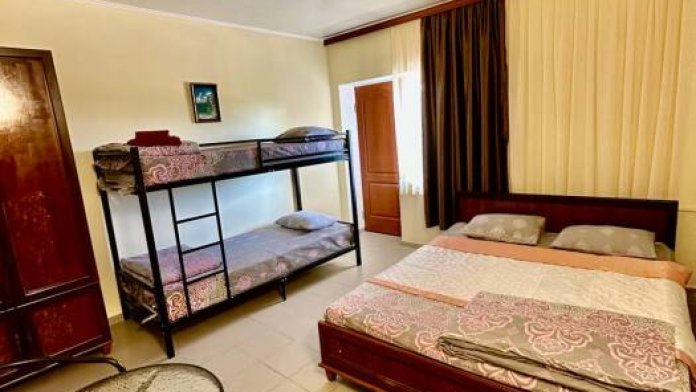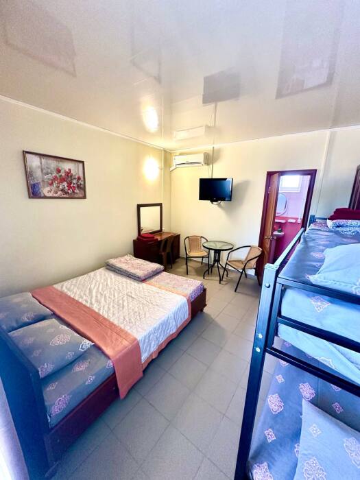Уютный семейный номер, рассчитан на размещение 4 гостей. В номере есть все необходимое для комфортного проживания: удобная двуспальная кровать и двухярусная кровать, прикроватные тумбочки, шкаф для одежды, туалетный столик, С/У с душем.