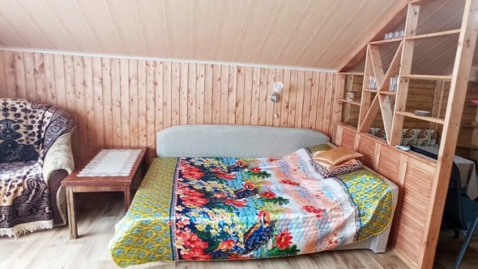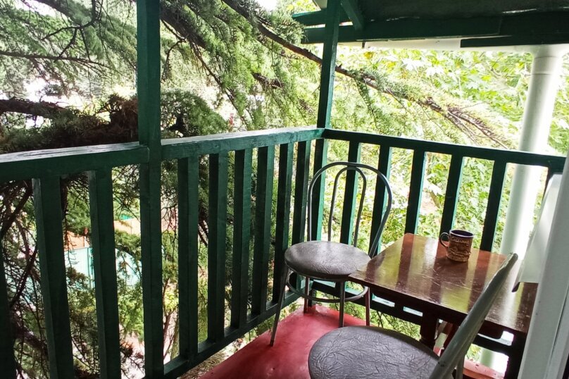 На кухне стоит электроплита, холодильник, микроволновка, электрочайник, имеется вся посуда. Санузел в номере, совмещенный. Балкон расположен с севера под ветками Крымской ели.
