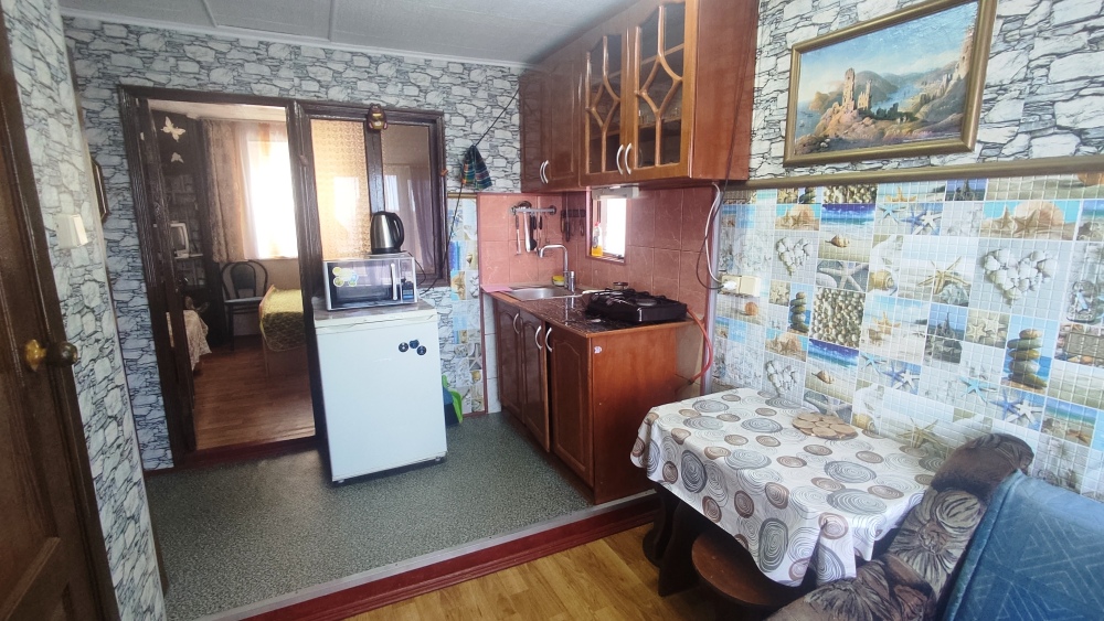 Небольшая, но оборудованная всем необходимым кухня: холодильник, газовая плита, электрочайник, микроволновка, вся посуда, горячая и холодная вода. В качестве дополнительного места стоит кресло-кровать.