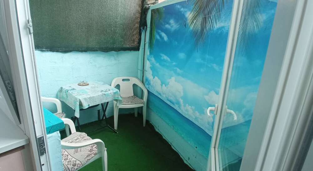 Есть небольшой закрытый от посторонних глаз балкончик, на котором стоит столик для отдыха.