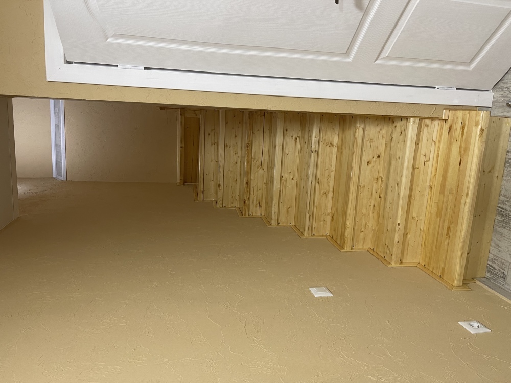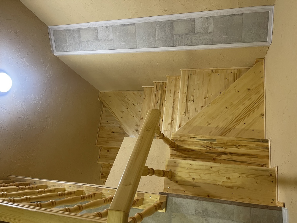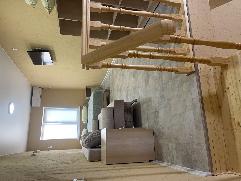 На первом этаже - кухня санузел, кресло-кровать. На втором этаже - двухспальная кровать, диван