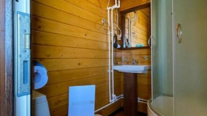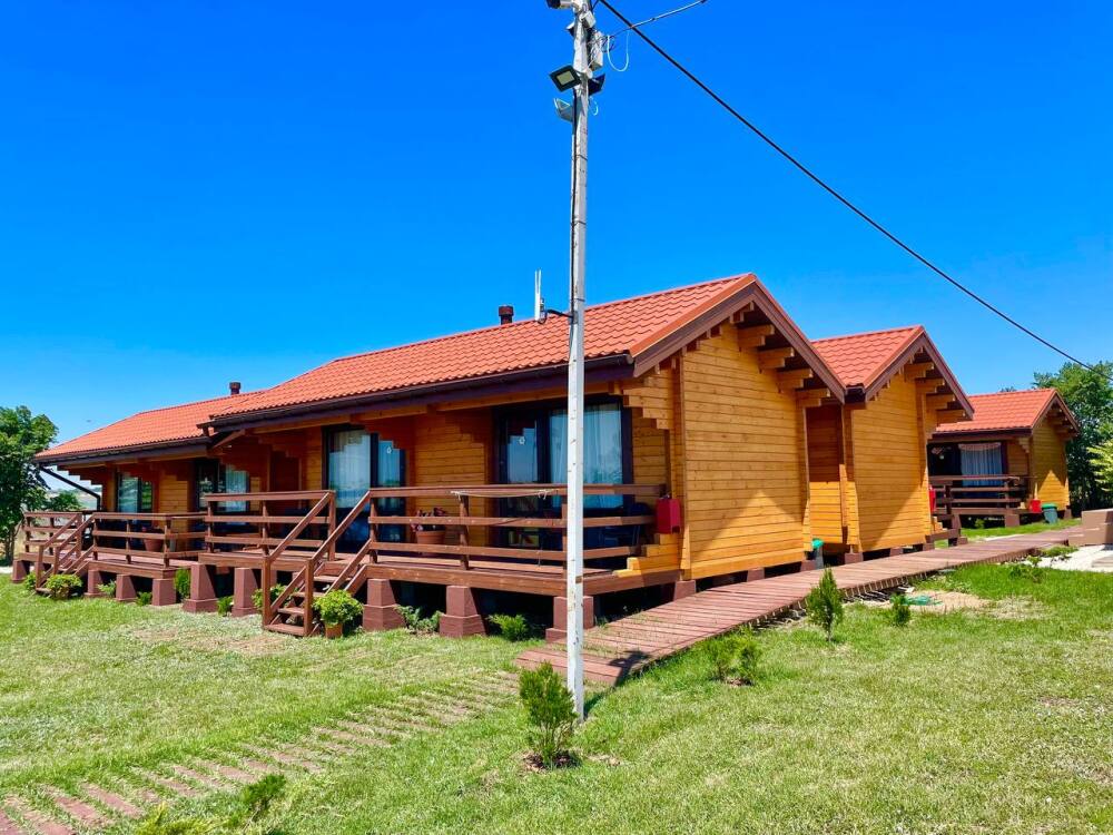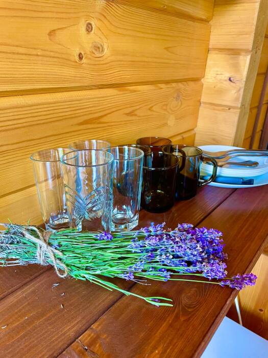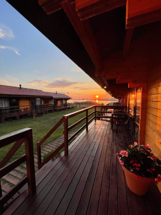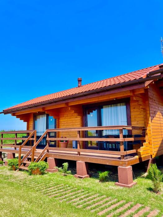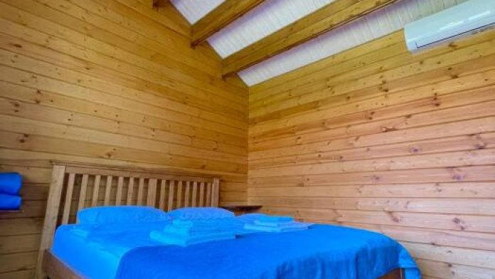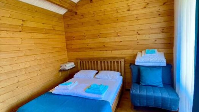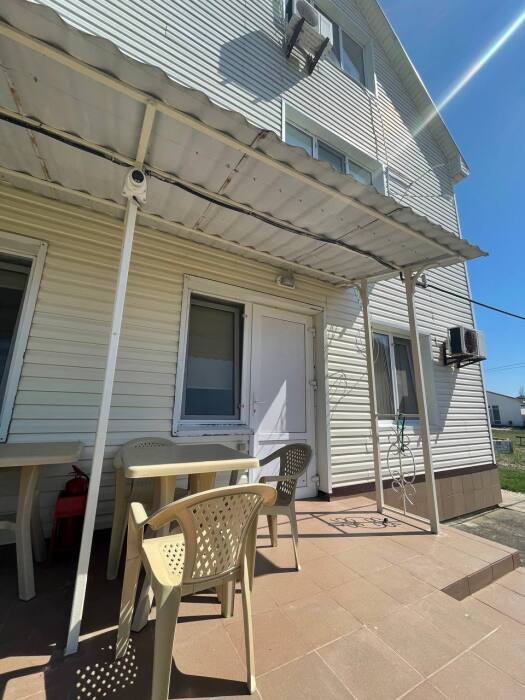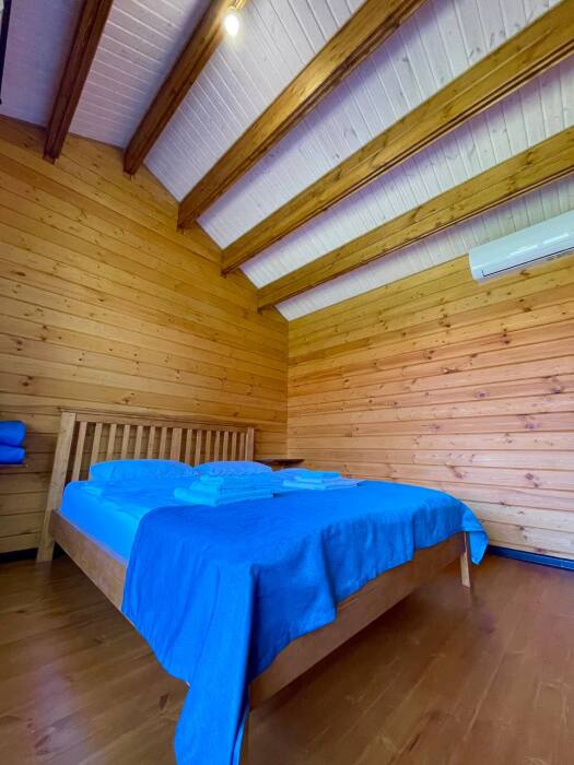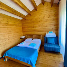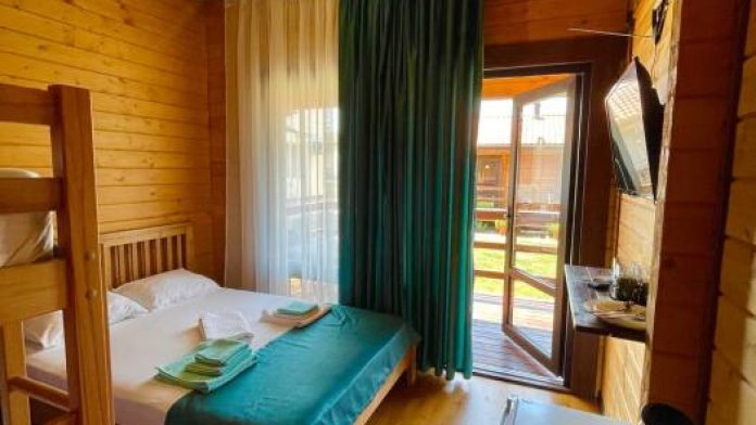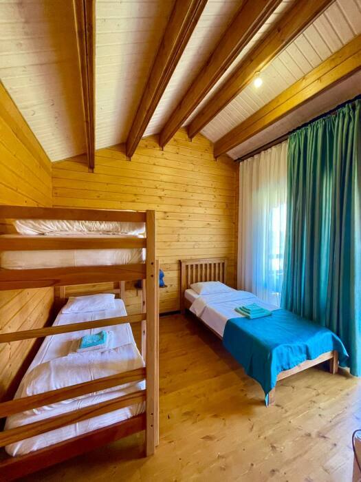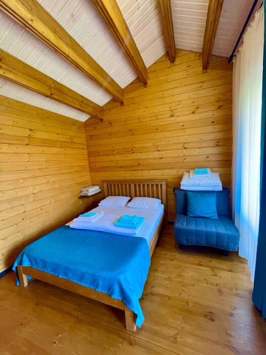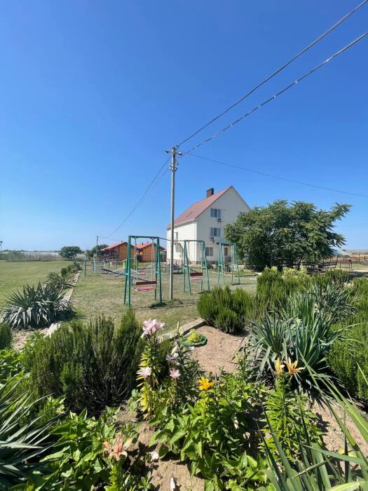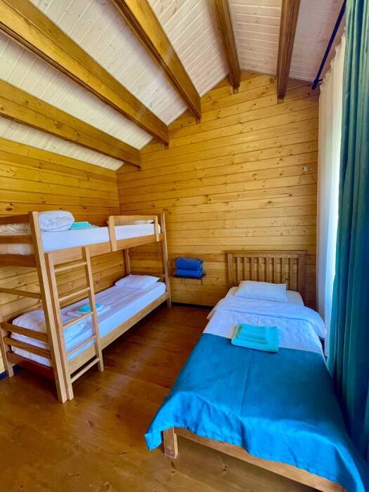 На территории есть детская площадка, новая общая просторная кухня. К Вашим услугам новые деревянные дома, 2021 года постройки, с просторной террасой и видом на море.