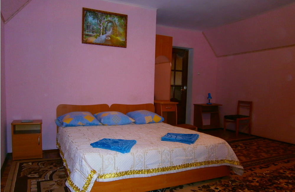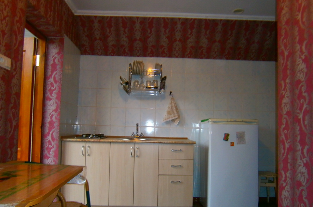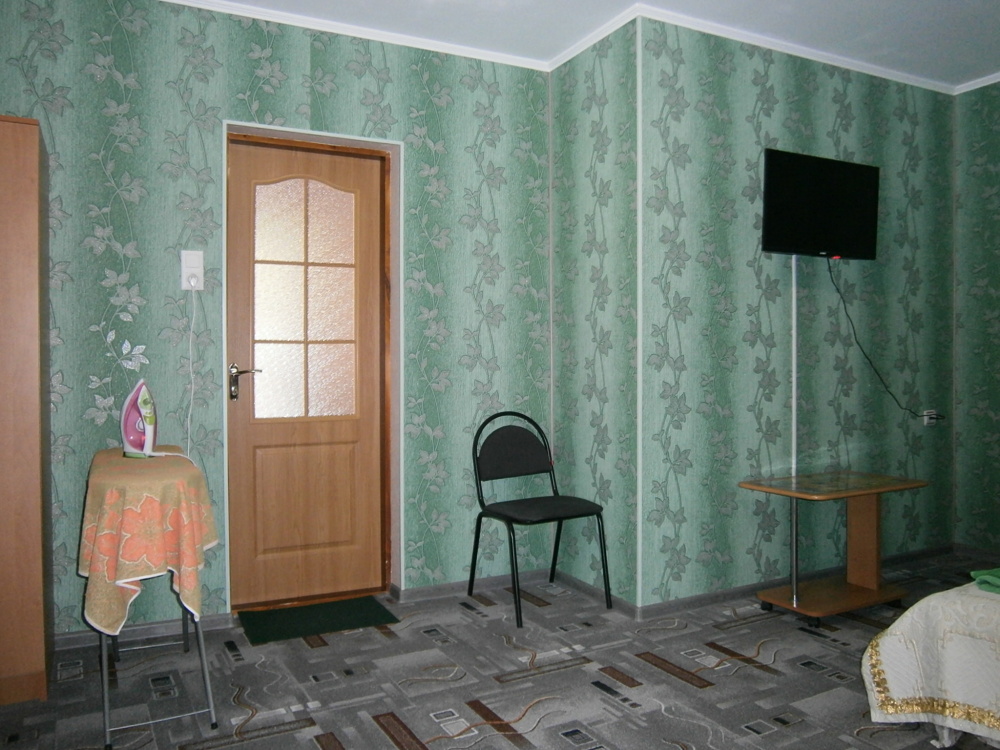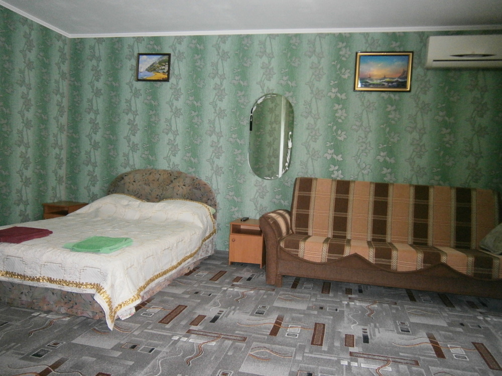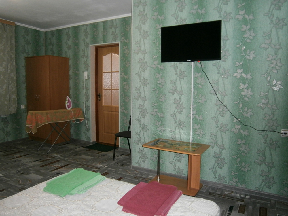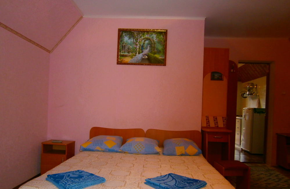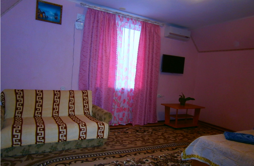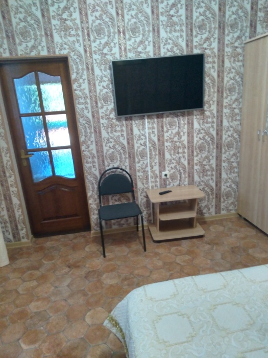 Номер №4 со всеми удобствами+ своя кухня. Отдельный вход. Вокруг всё в зелени. В номере: спальные места: двухспальная кровать и диван кровать (возможно 4 чел)Мебель: шкаф, стулья, журнальный столик, телевизор, кондиционер, гладильная доска и утюг. Кухня оборудована всем необходимым инвентарем: холдильник, посуда, нагревательный прибор (колонка) обеденая зона.