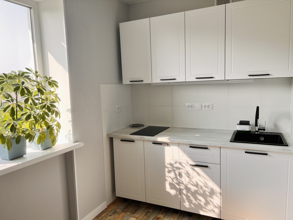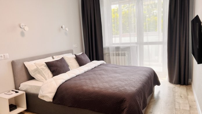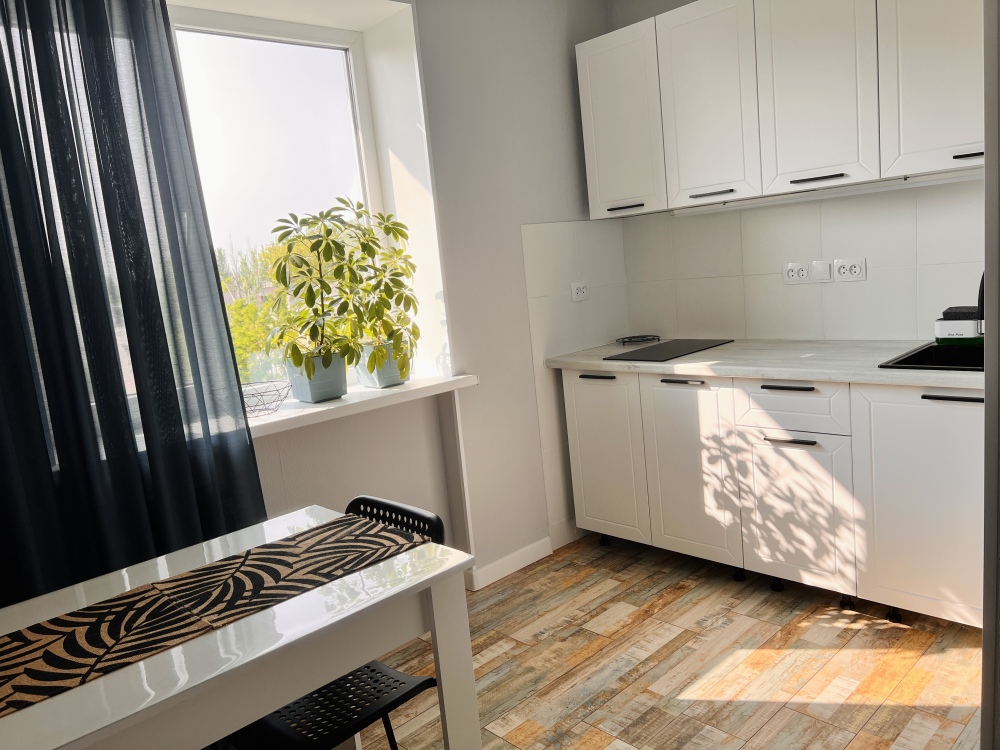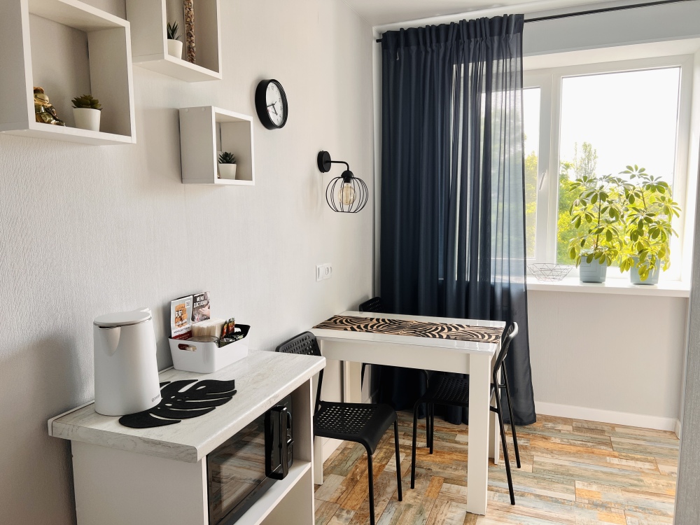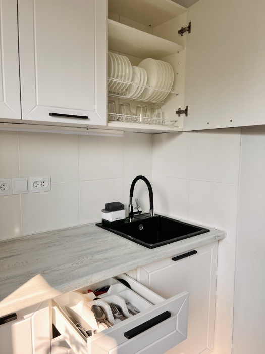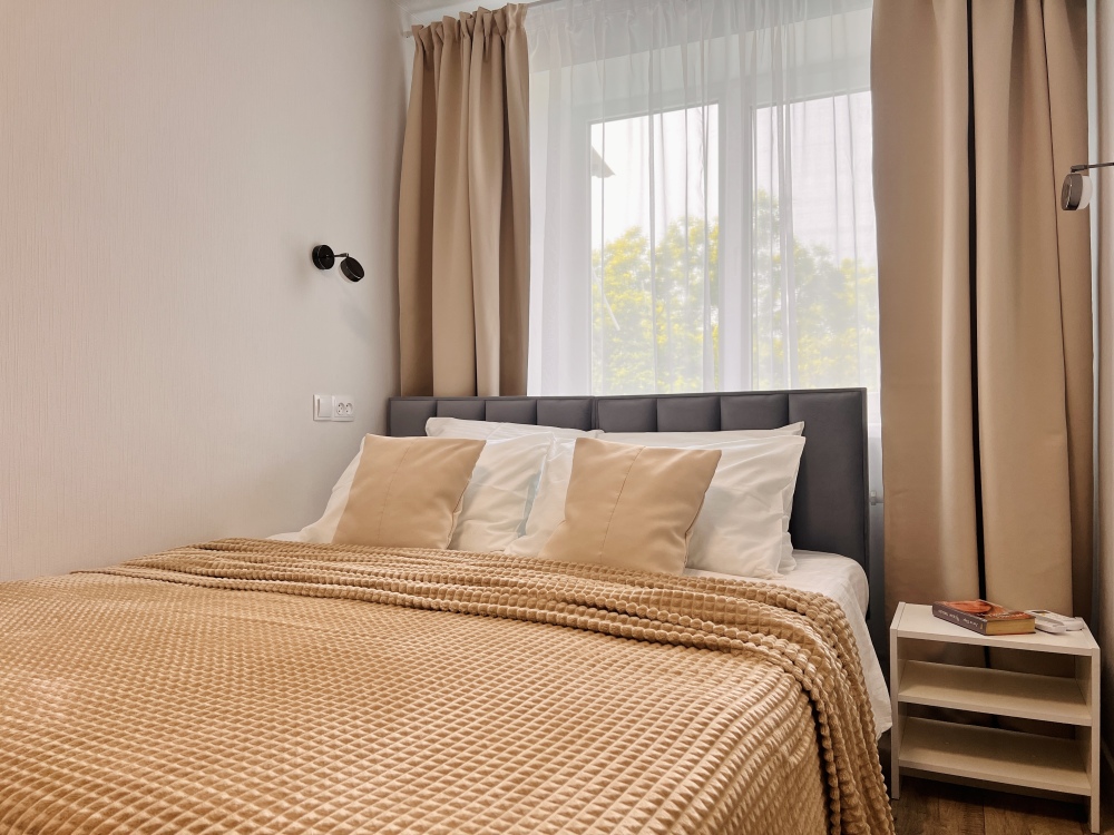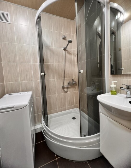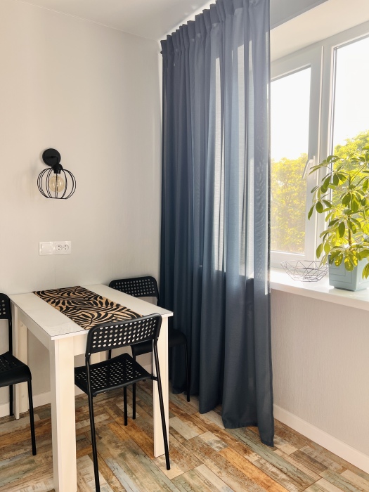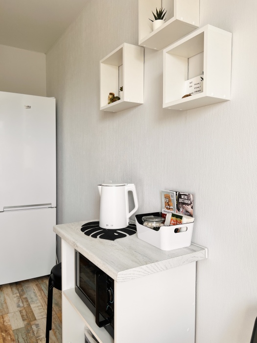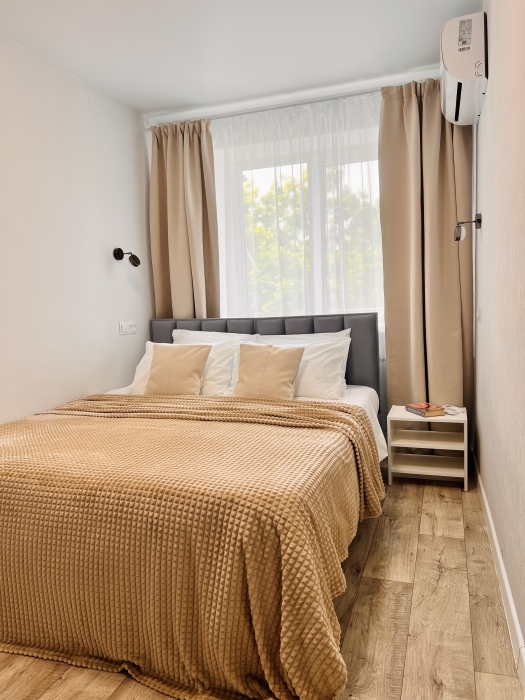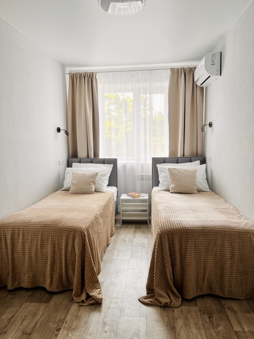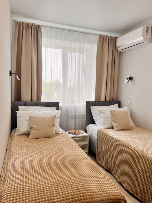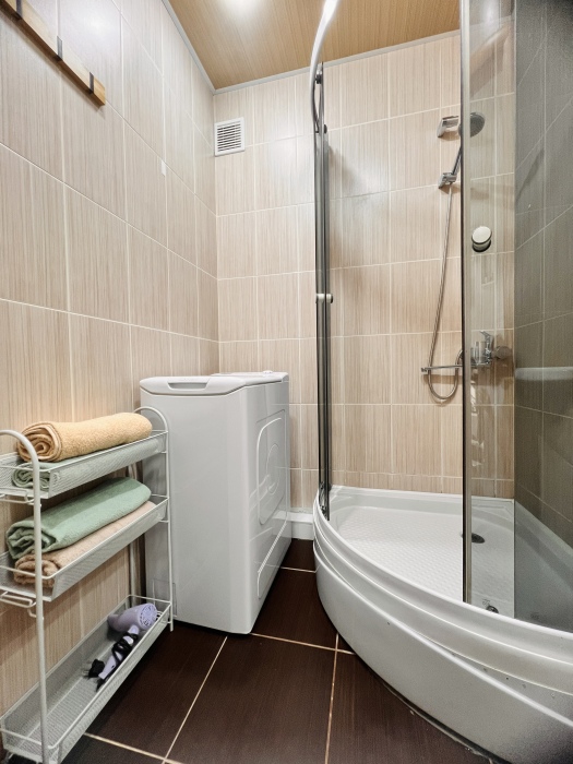 В квартире есть все для комфортного проживания. Удобная двуспальная кровать, диван, две односпальные кровати, телевизор, кондиционер. На кухне электрочайник, микроволновка, холодильник, электроплита. В ванной - стиральная машина, водонагреватель.
