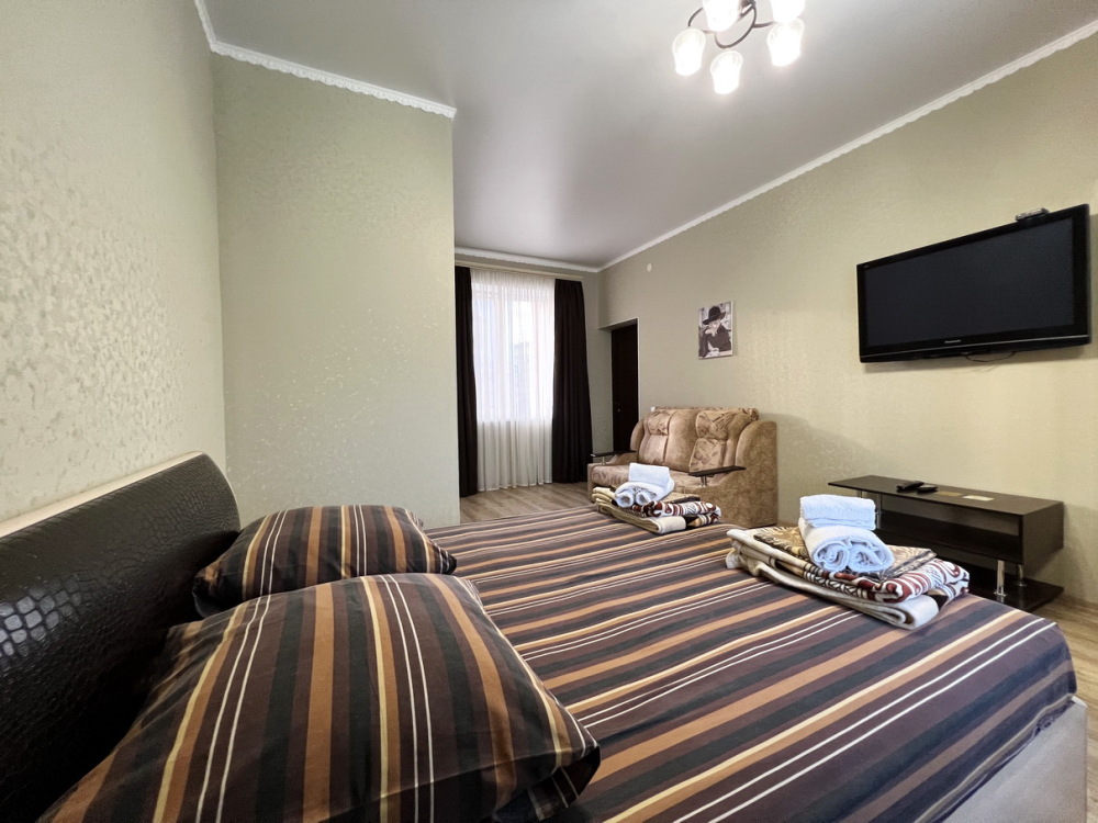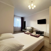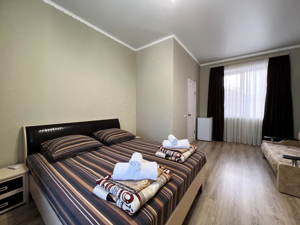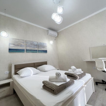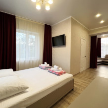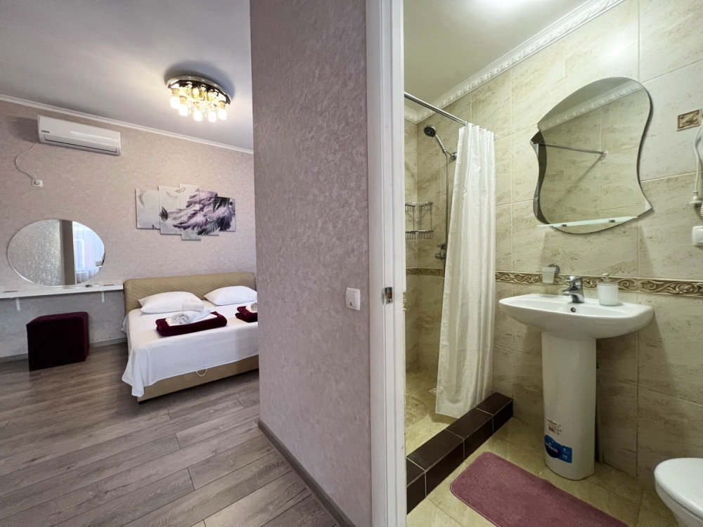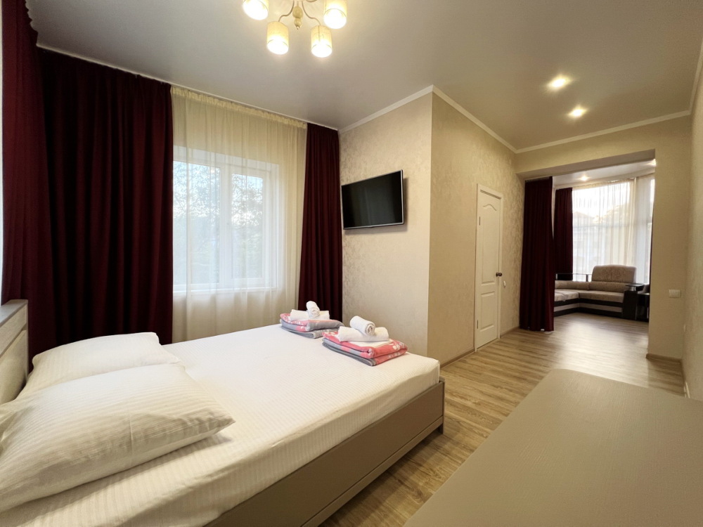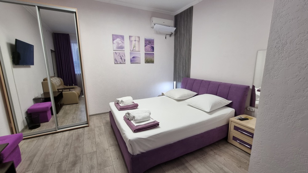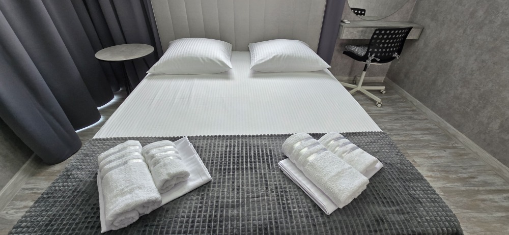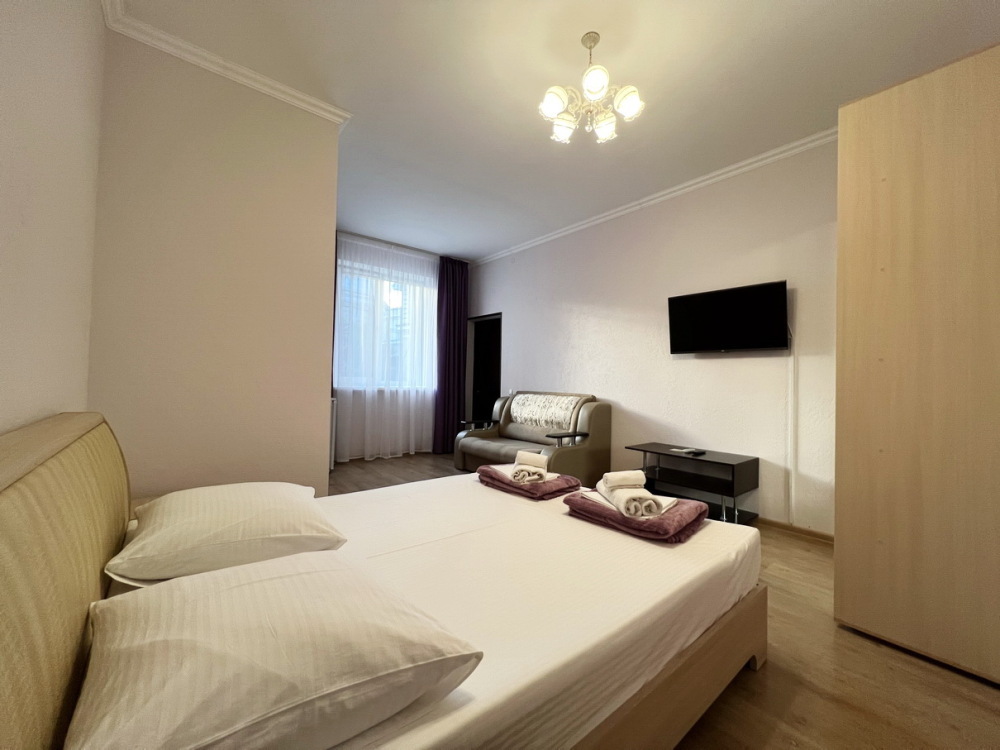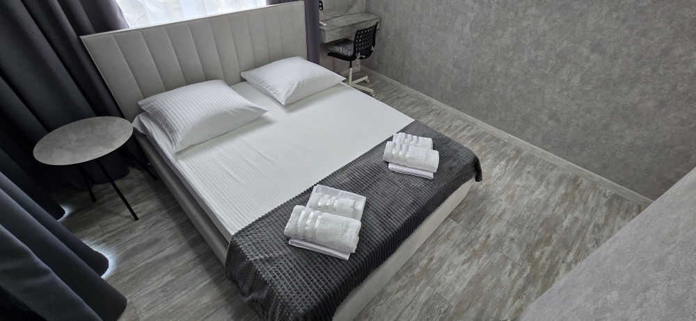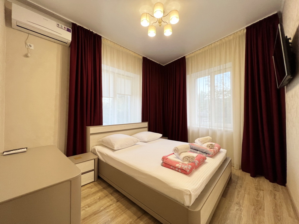 Шикарная двухспальная кровать с ортопедическим матрасом и идеально чистым постельным бельём гарантированно обеспечит полноценный сон и возможность набраться сил.Комфортный отдых в номере обеспечивается наличием кондиционера,телевизора,бесплатного интернета и много того,что создаёт условия для благоприятного пребывания в номере.