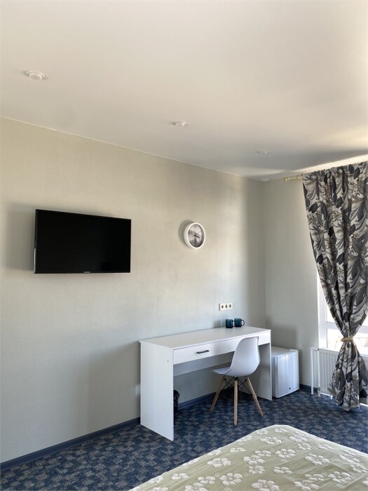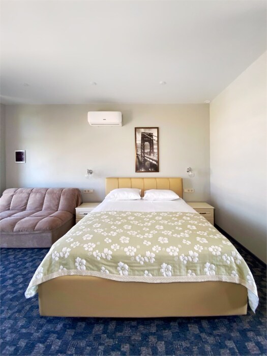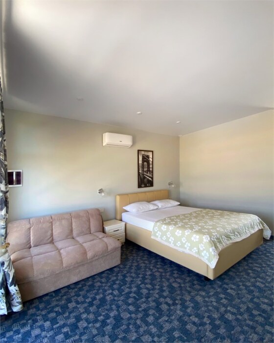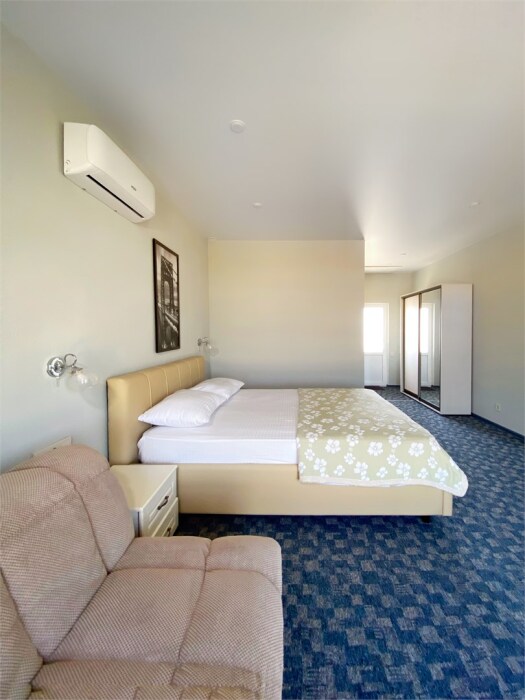 Гостям, для проживания, предлагаются номера со всем необходимым для комфортного отдыха. В номере все удобства: холодильник, чайник, посуда, кондиционер, телевизор Smаrt, Wi-Fi, стол, стулья, диван, большой шкаф-купе, кровать с ортопедическим матрасом и подушками, прикроватные тумбы, фен, сейф, санузел.