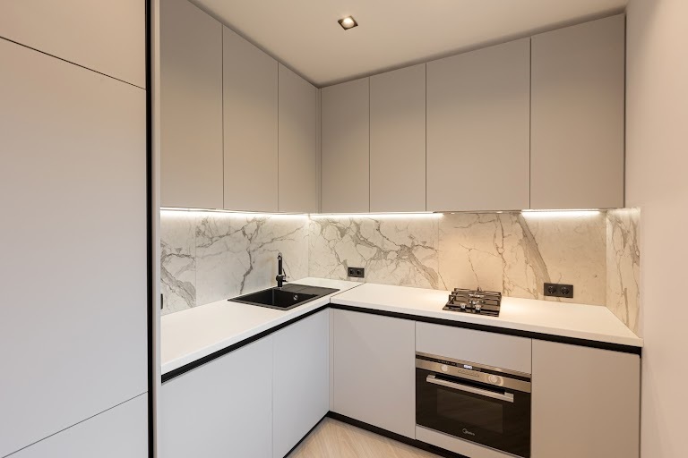Современная кухня оборудована газовой плитой, духовкой с функцией СВЧ, холодильником, электрическим чайником и блендером. В наличии вся необходимая посуда, столовые приборы и чайный набор.