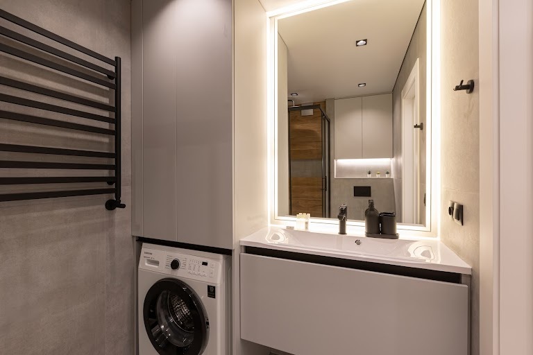 В ванной комнате вас ждет теплый пол, стиральная машина, белоснежные полотенца и все необходимые средства гигиены.