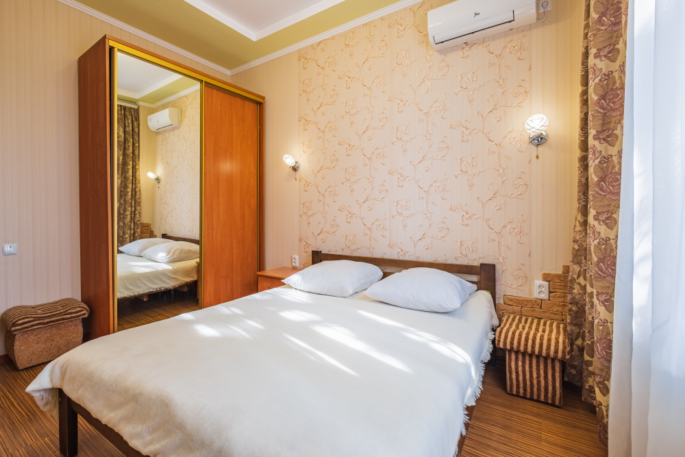 Комнаты в номере раздельные. Первая с двуспальной кроватью с удобным анатомическим беспружинным матрасом. Во второй комнате удобный двуспальный диван. В каждой комнате плазменный телевизор и кондиционер для Вашего удобства. Многие наши гости, с удовольствием спят и отдыхают на террасе на свежем чистом воздухе.
