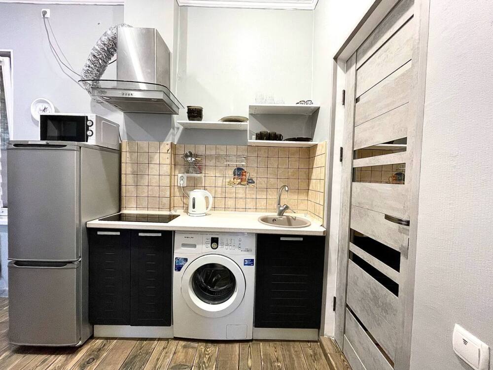 Кухня полностью укомплектована посудой и техникой.