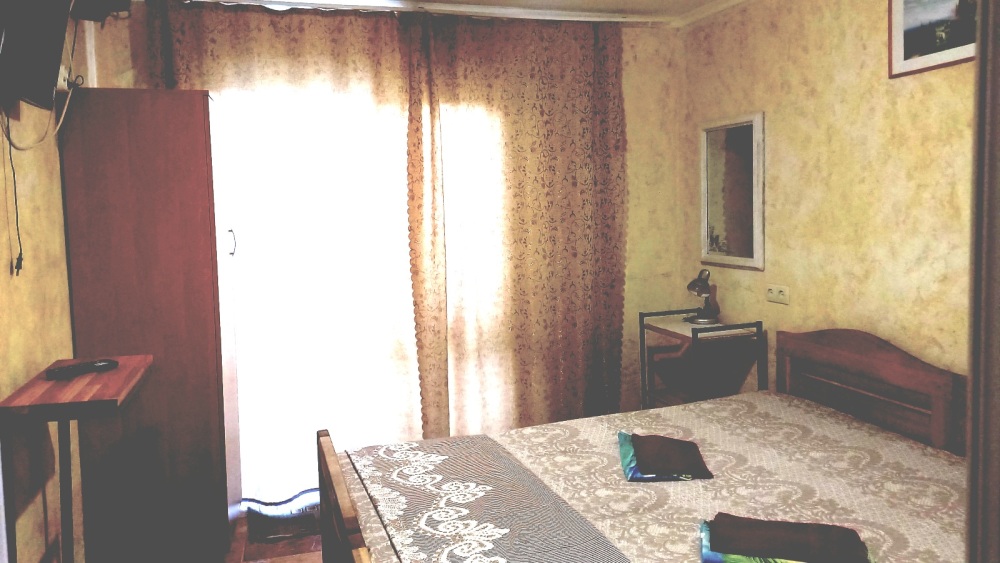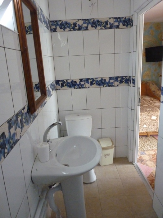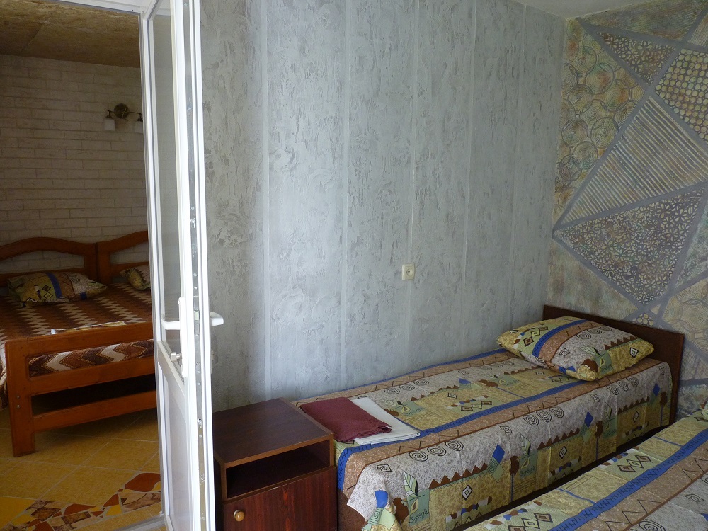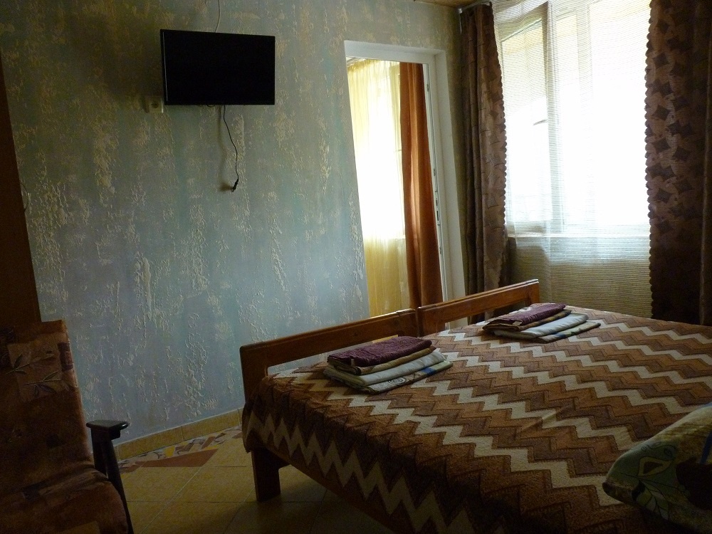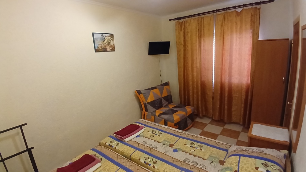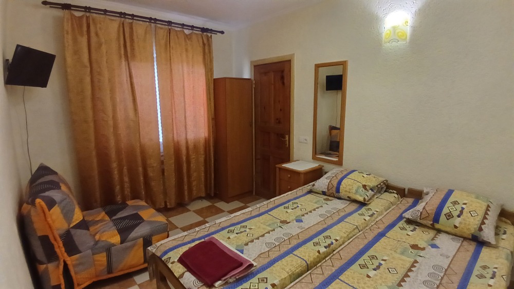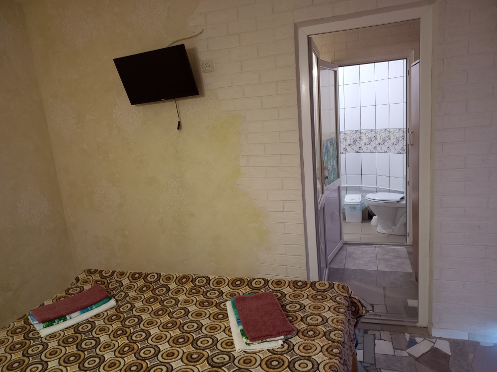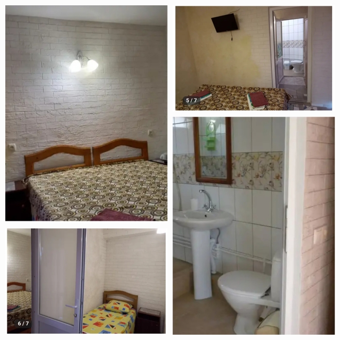 Отдельный домик на два 3-х местных номера . Раздельный сан узел и душ . Горячая и холодная вода круглосуточно. В каждом номере телевизор плазма, холодильник, две кровати, диван .