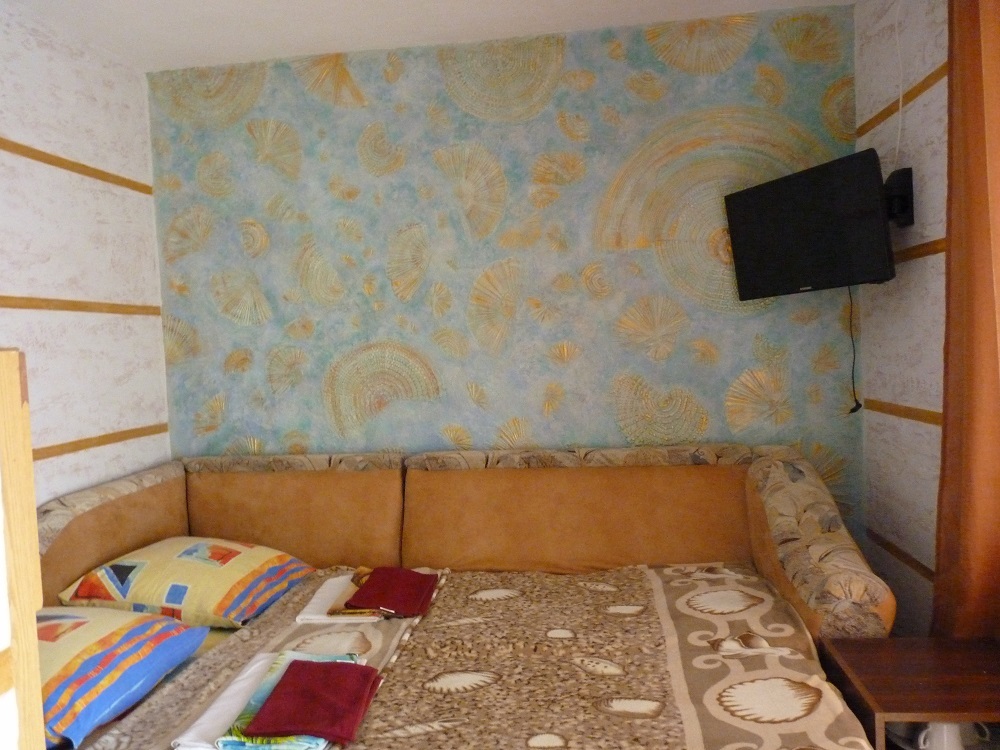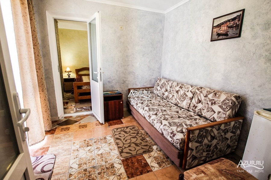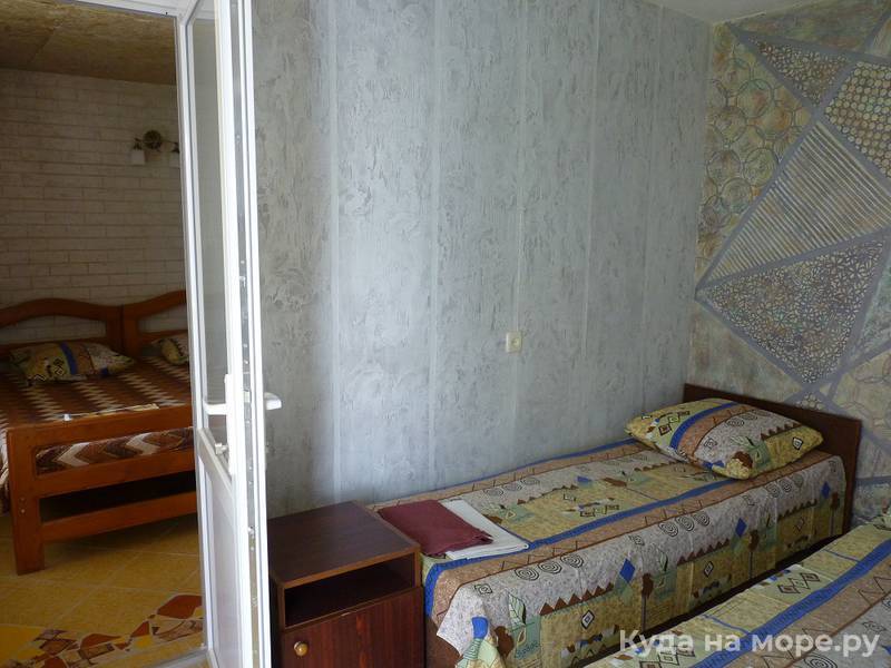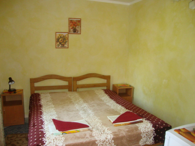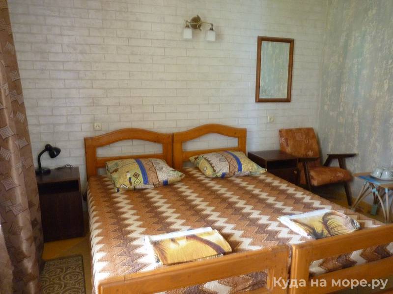 Семейный домик на 3-4 человека двух комнатный в одной комнате две кровати тумбочки ,телевизор плазма во второй комнате диван на 1-2 места , холодильник шкаф тумбочки; кухня рядом с домиком на несколько номеров