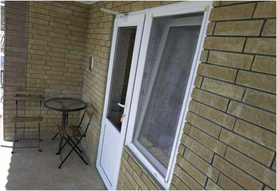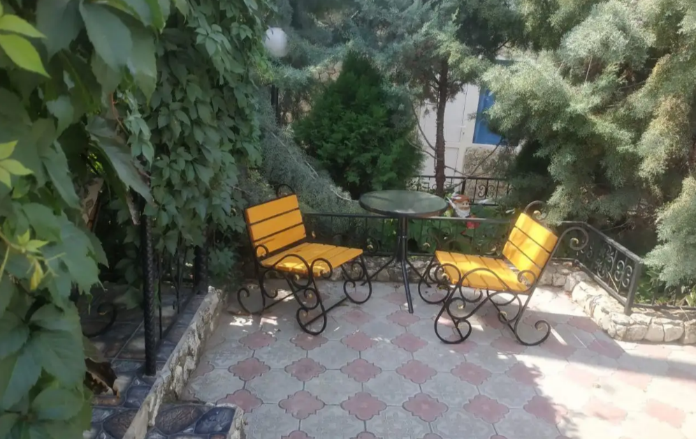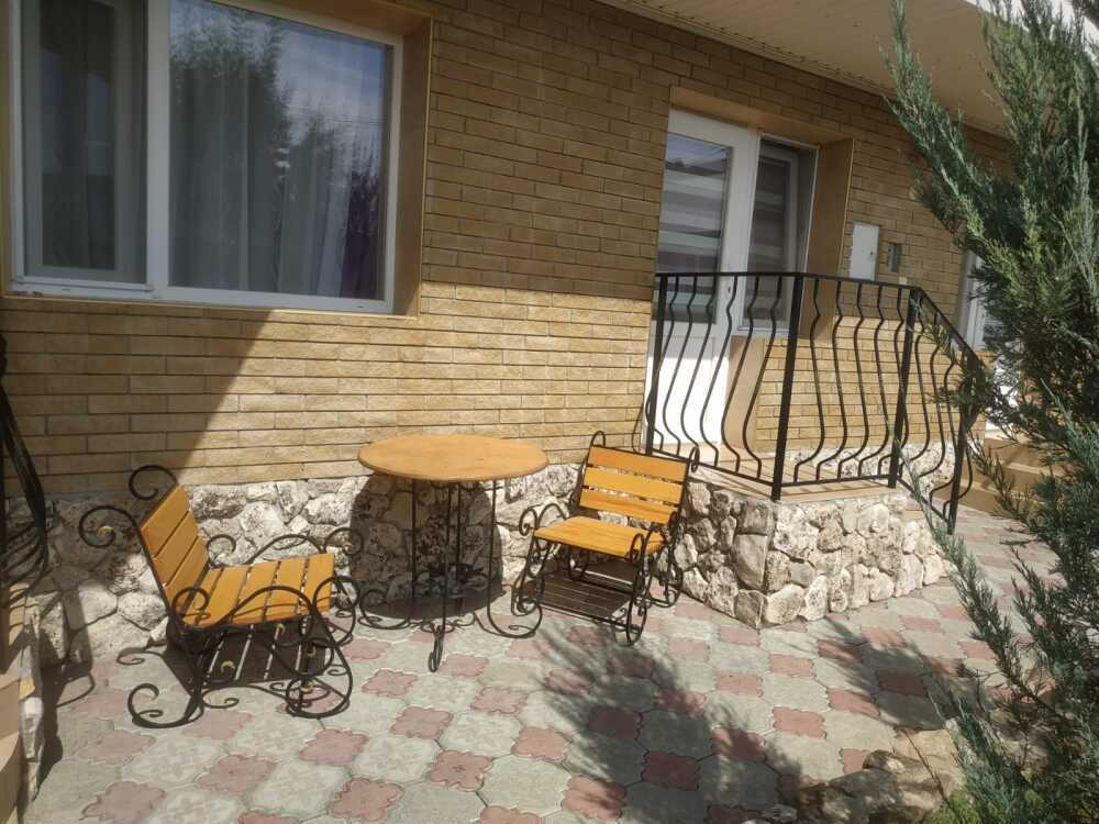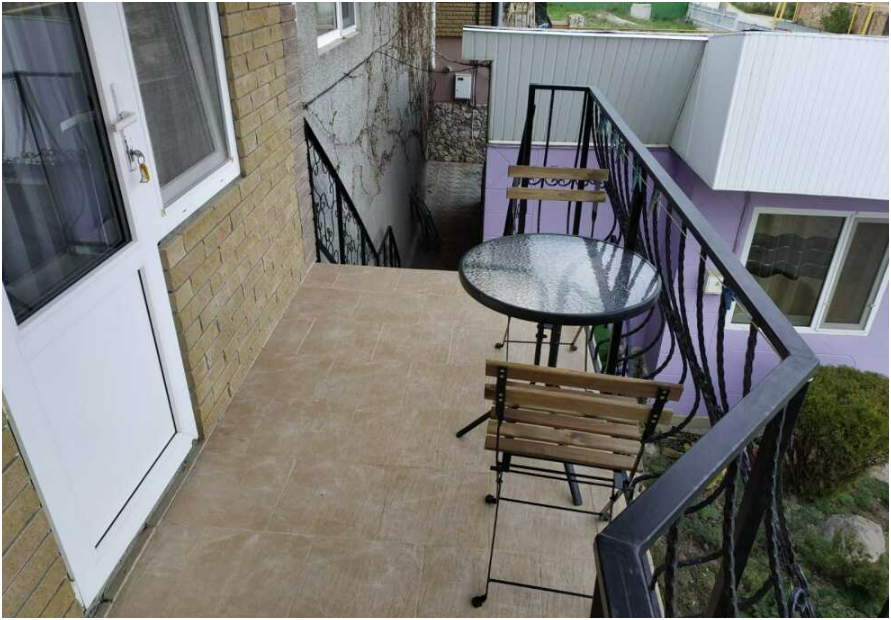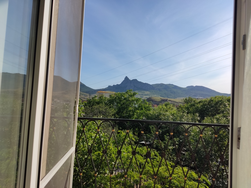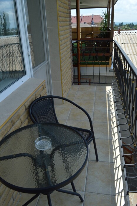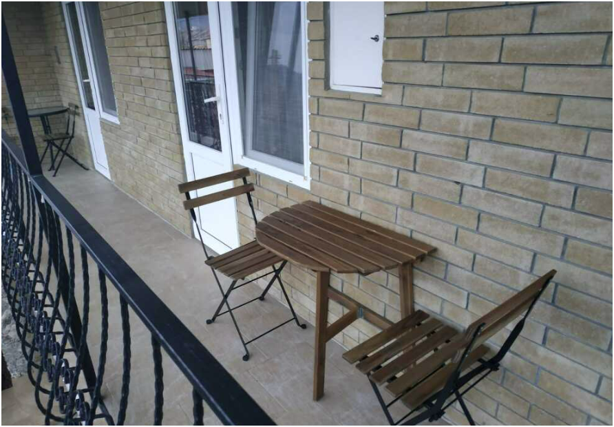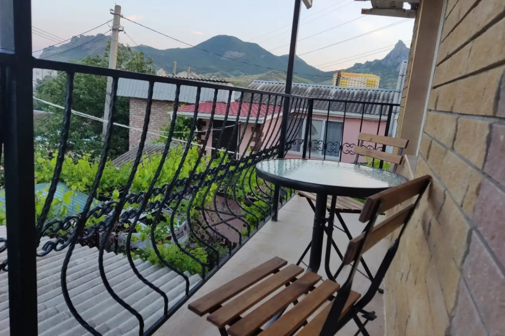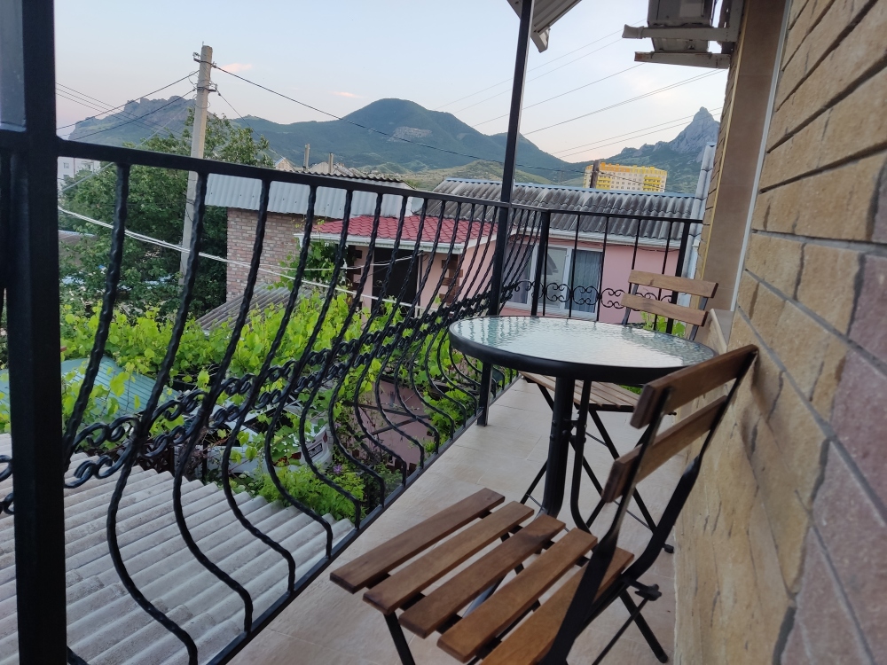 Возле входа: стол и кресло для отдыха. С балкона открывается вид на гору Кара-Даг и на внутренний двор.