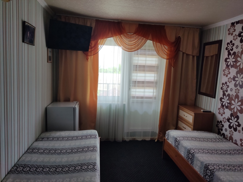 Кровати: 2 односпальные кровати или двуспальная кровать. В комнате: санузел (душ, унитаз, умывальник), холодильник, телевизор, кондиционер.