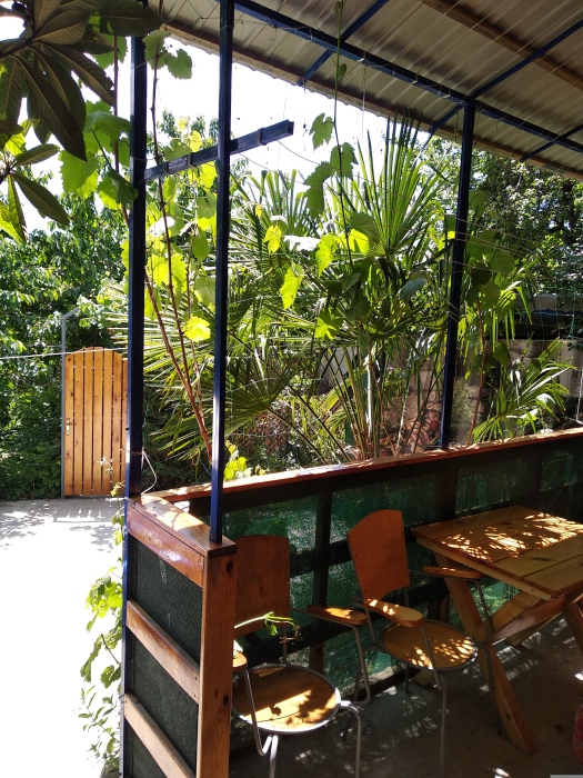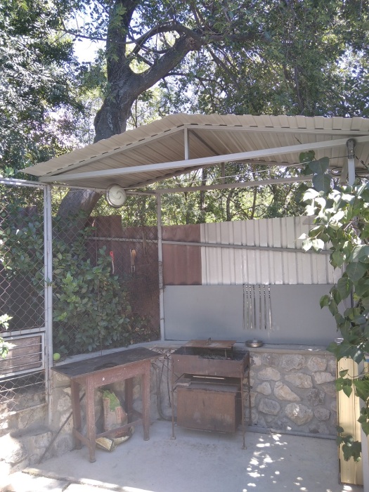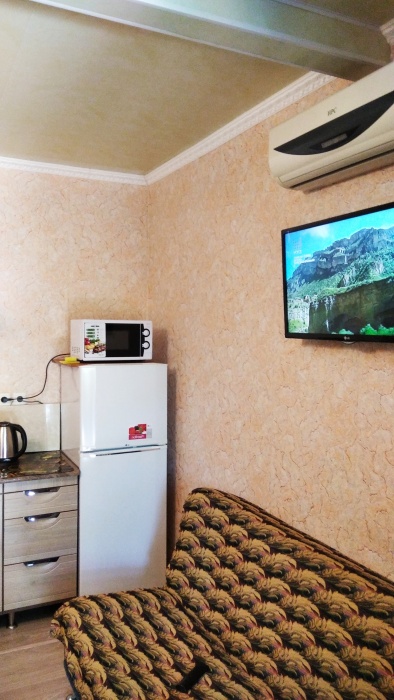 Дом состоит из комнаты, кухни, санузла. Горячая, холодная вода постоянно, кондиционер, Wi- fi. Возле домика большой зеленый двор, мангал, место для отдыха и авто. Парковка во дворе на территории на 3 машины под видеонаблюдением и на 2 машины за территорией возле дома (так же под видеонаблюдением).
