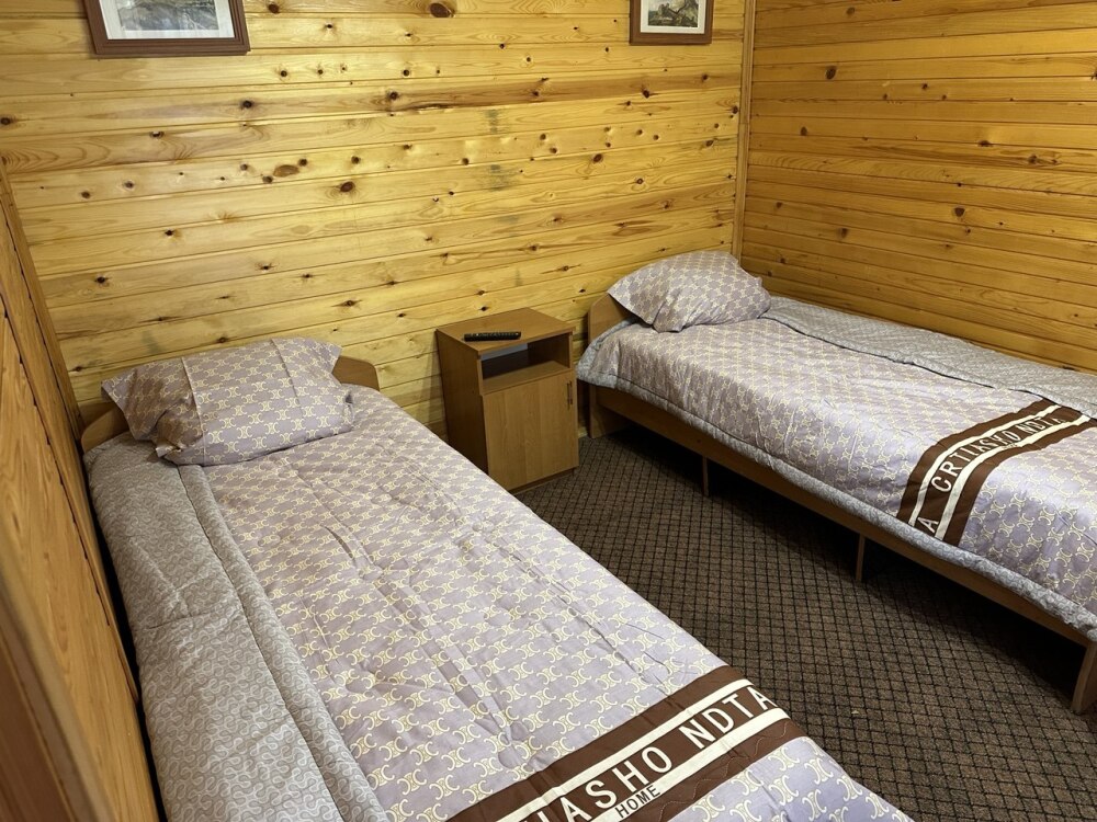 - Мебель: Двуспальная кровать (размеры ~180x200 см), односпальная кровать журнальный столик, стол со стульями, шкаф.