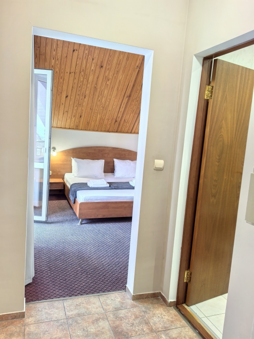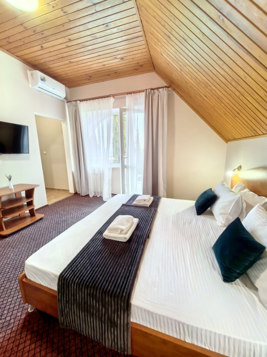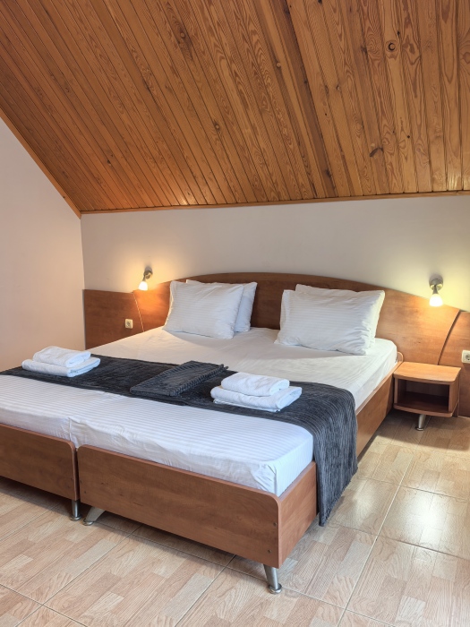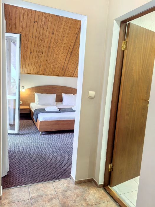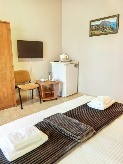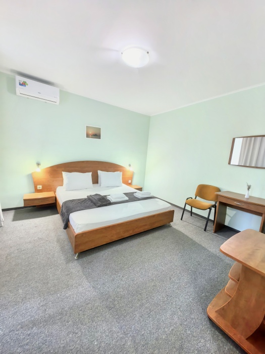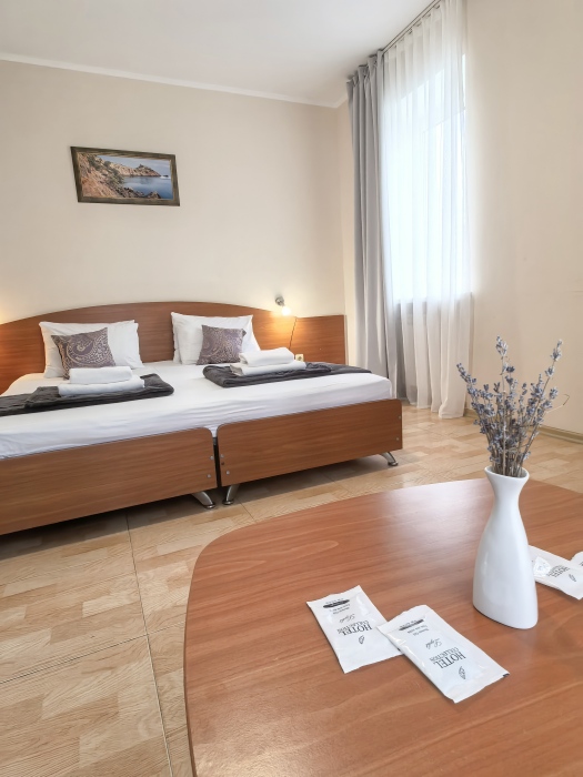 В номере двуспальная или две односпальные кровати на ваш выбор с выходом на свой балкон.
