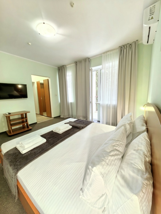 Одна комната – спальня с двуспальной кроватью, с выходом на свой балкон, во второй комнате находится раздвижной угловой диван.