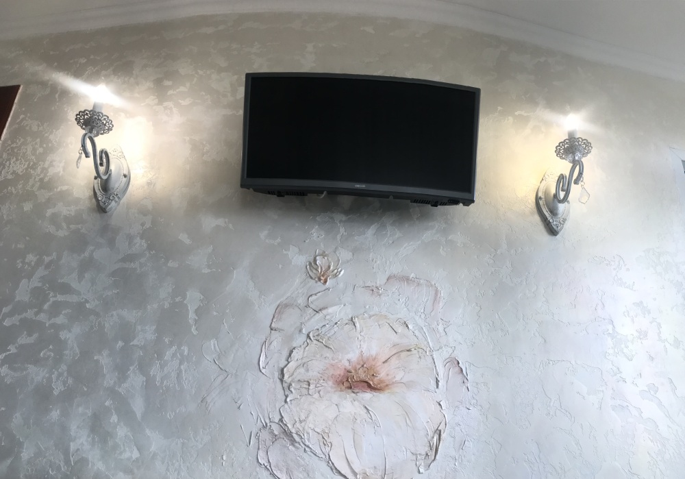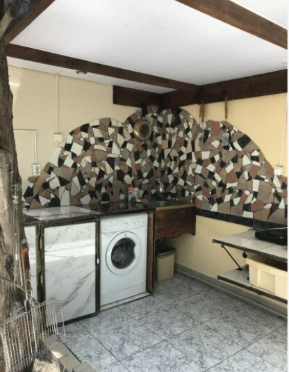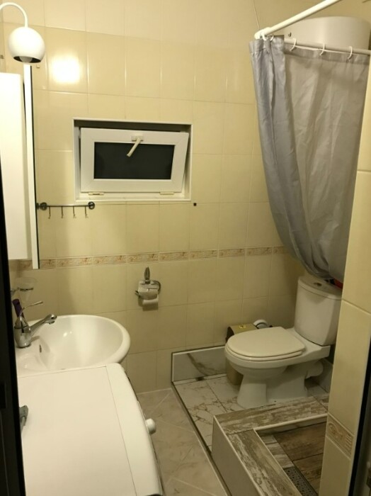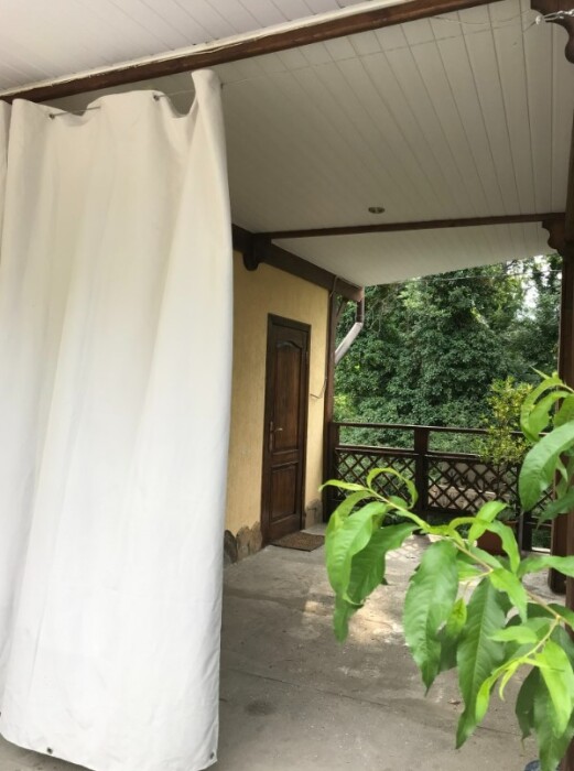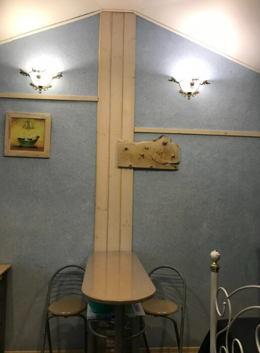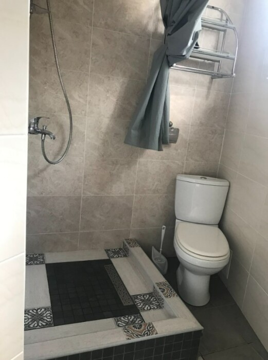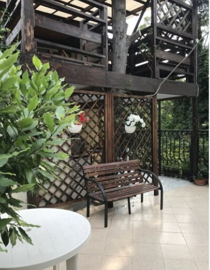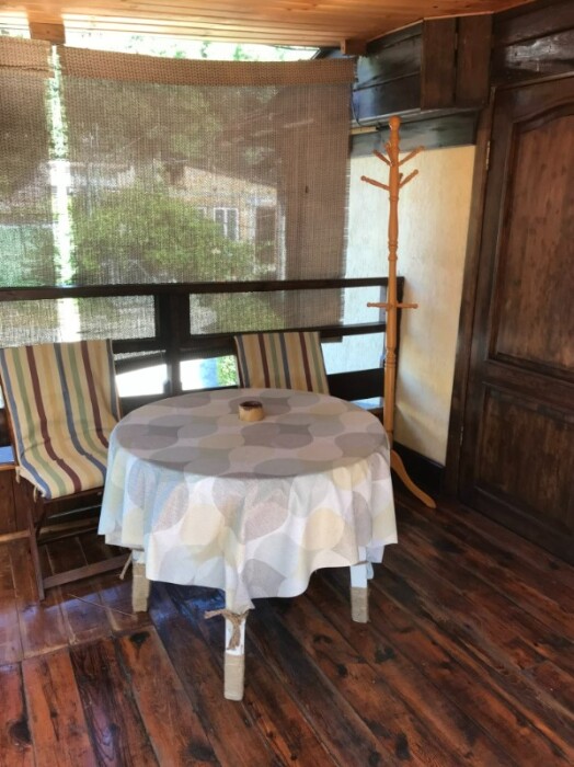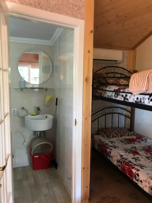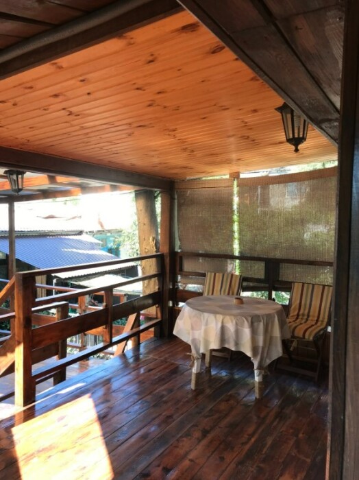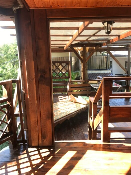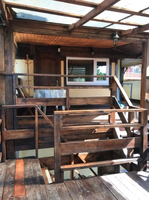 Номер оформлен деревом, К номеру примыкают 2 площадки (одна с дастарханом). Вход в номер по ступенькам. Стиральная машинка и кухня находятся ниже на площадке.