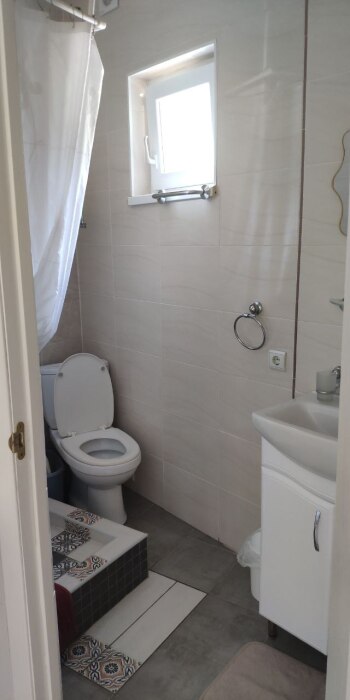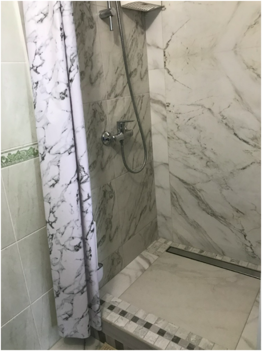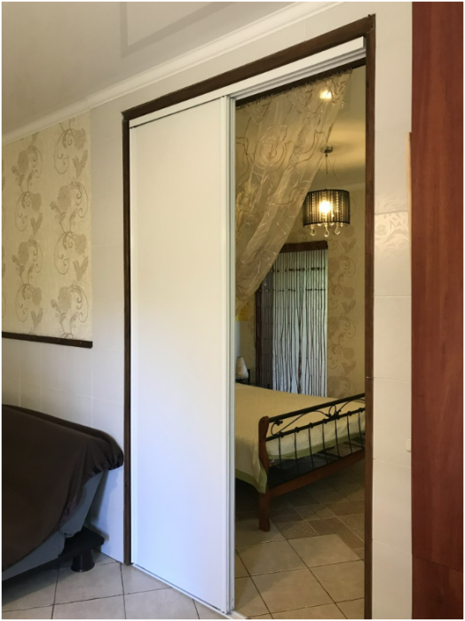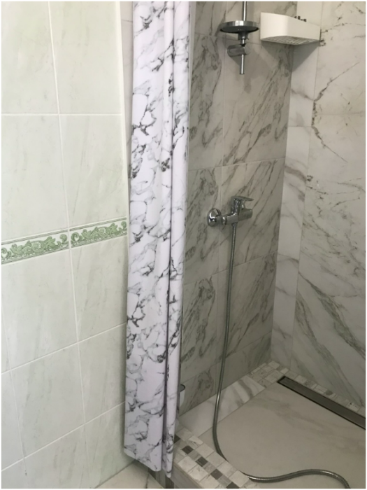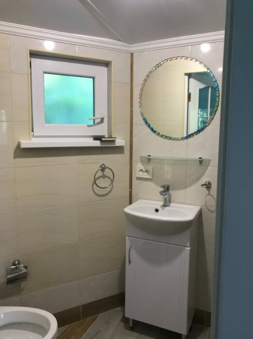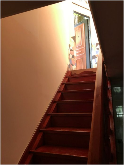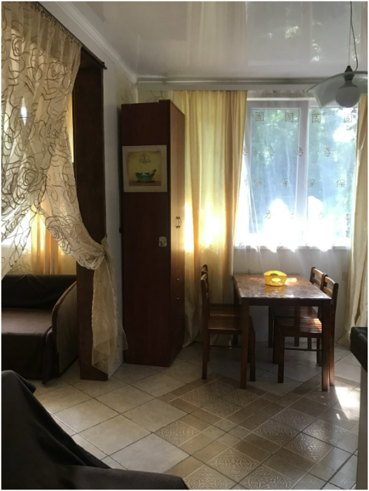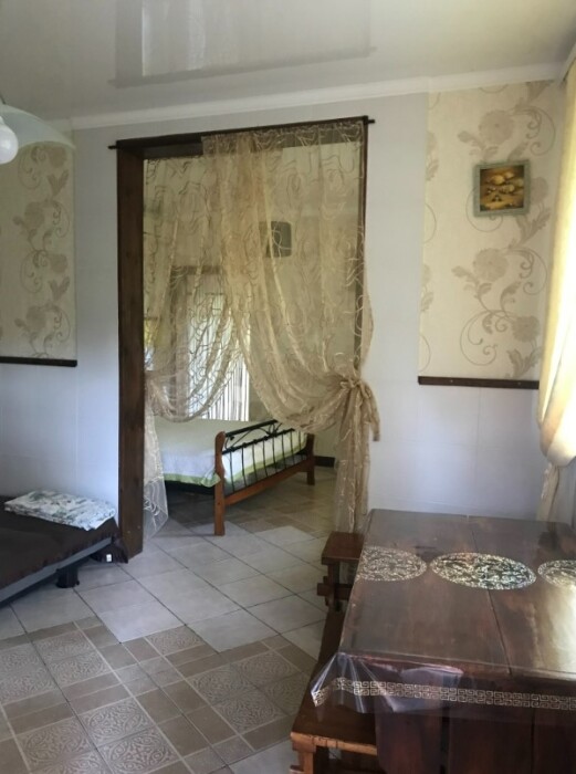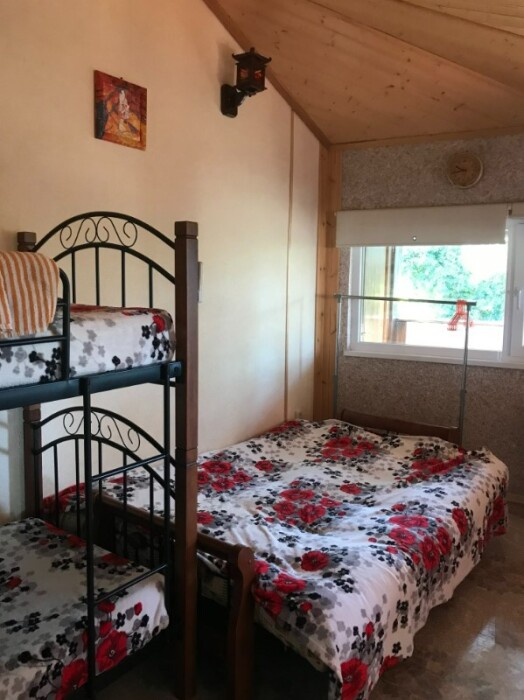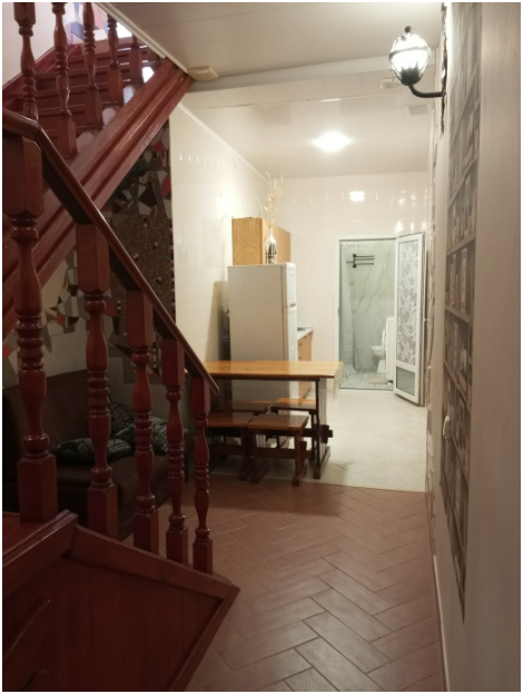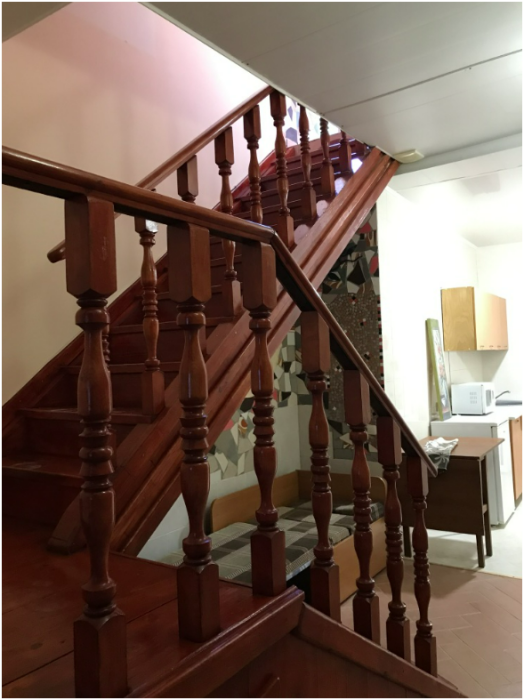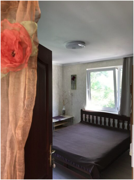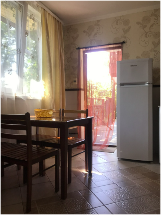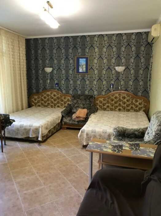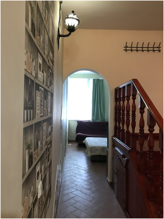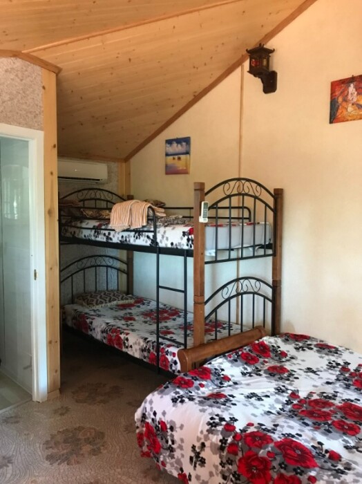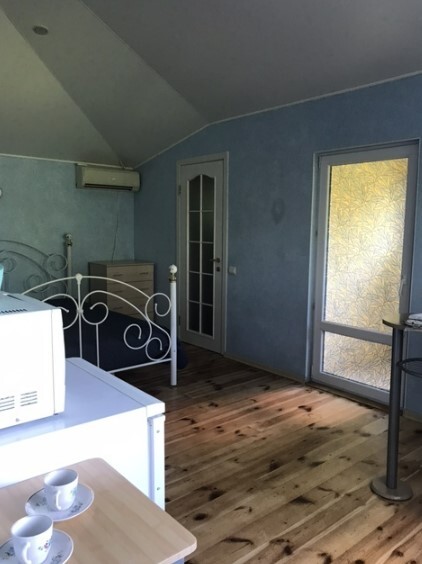 Особенность номера - он с входом с верхней площадки, окно полноценное и выходит на клумбу и улицу( не шумно). Перед входом в номер столики и кухня общая.