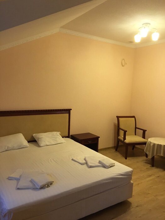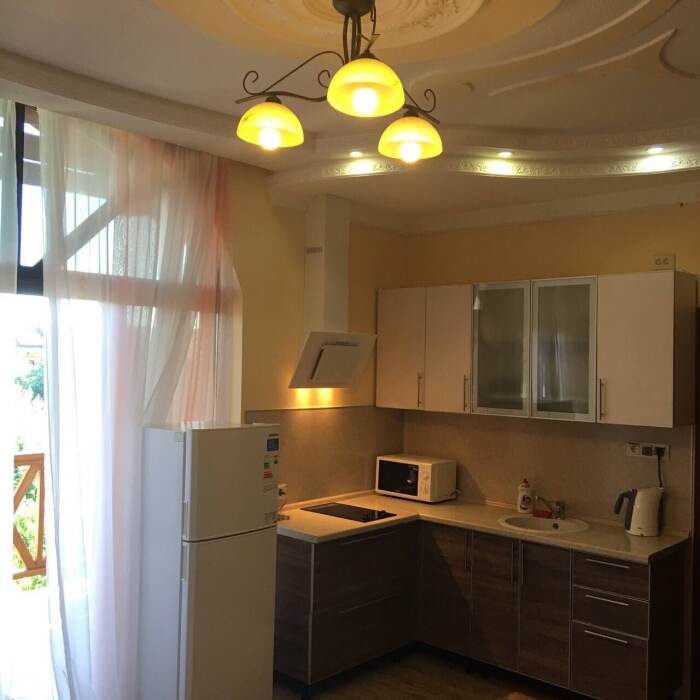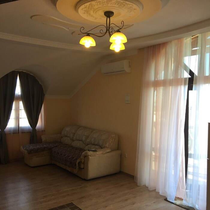 Отдельно стоящий двухэтажных дом. На 1 этаже с собственной зоной отдыха: беседка, мангал. На 2 этаже с видом на море, балкон 20 кв м, мебель, отдельный вход. Номер трёхкомнатный: кухня-гостиная с полным набором посуды, СВЧ, электроплита, чайник, двухкамерный холодильник, обеденный стол, кондиционер, smart TV, угловой раскладывающихся диван, шкаф купе. Две спальни: в одной двухспальная кровать, в другой - две односпальные. Санузел: унитаз, биде, умывальник, душ, шкаф, фен, гигиенические принадлежности, полотенца, халаты.