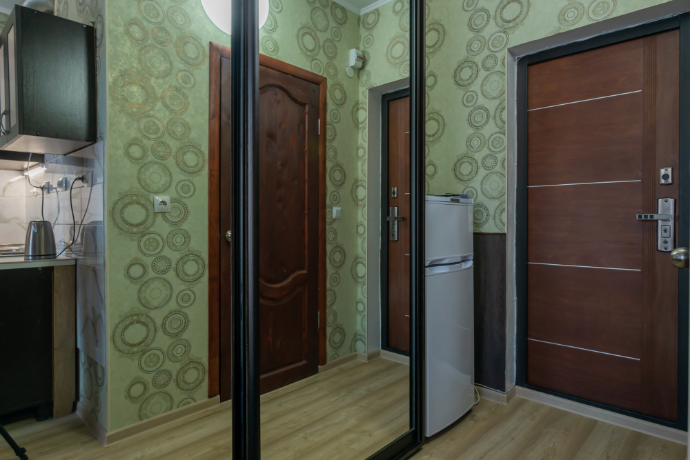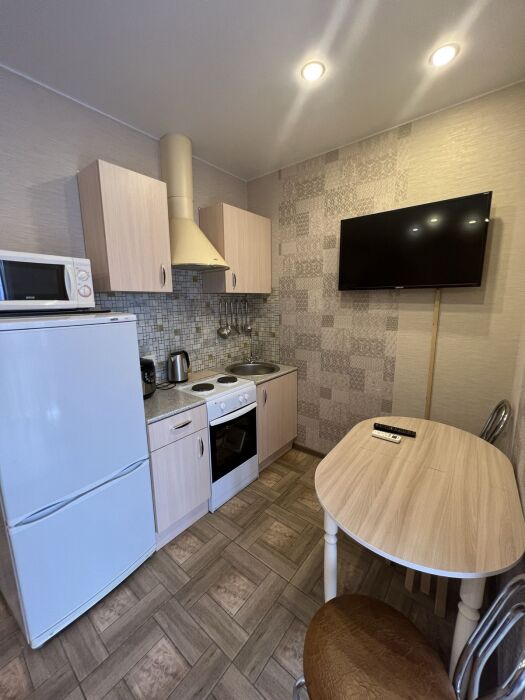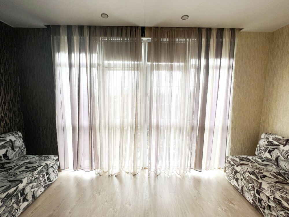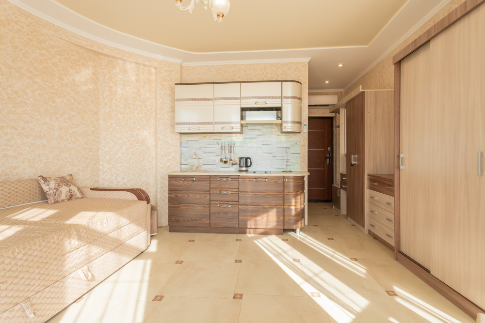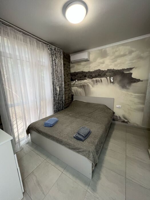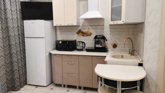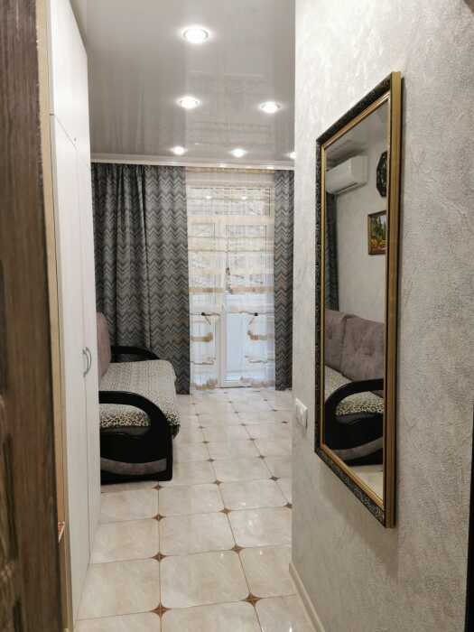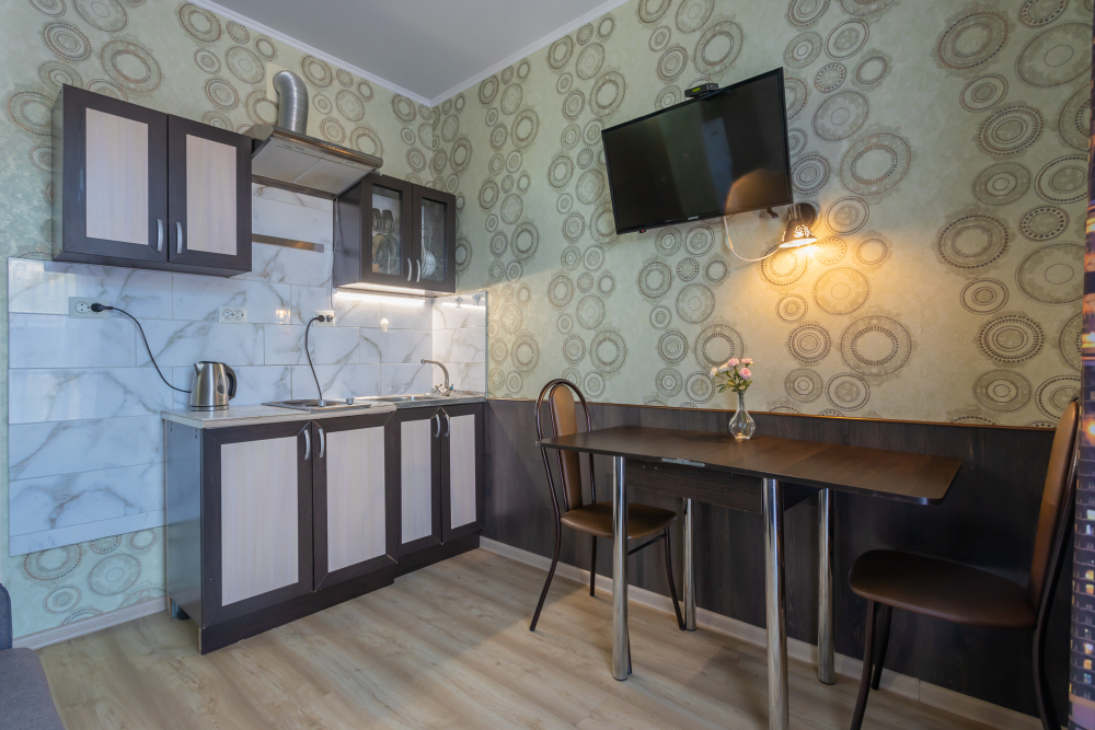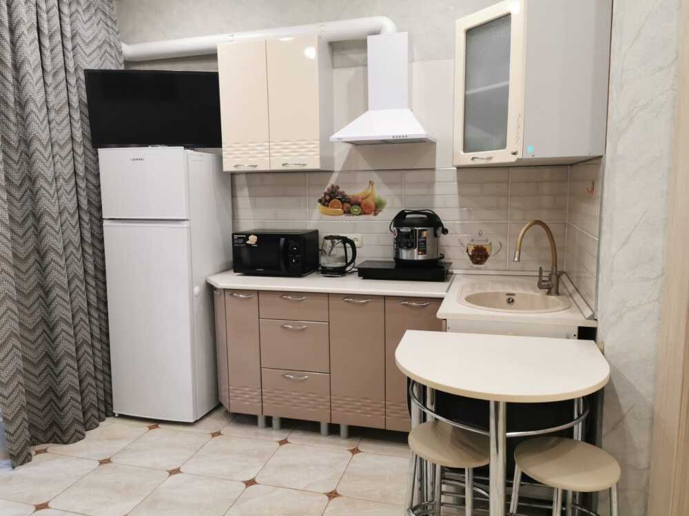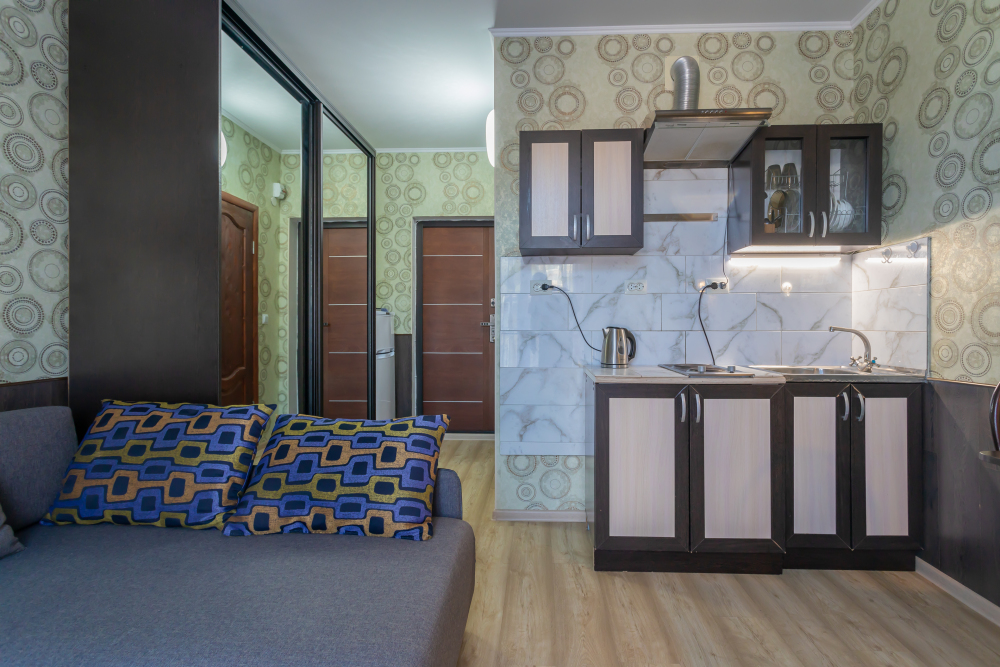Небольшой уютный номер с полноценной кухней. В номере есть варочная поверхность, набор посуды, большой раскладной диван, балкон.