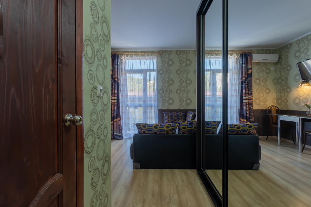 Апартаменты находятся в курортной зоне, в красивейшем месте, в 300 метрах над уровнем моря. Именно на этом расстоянии происходит целебное смешение потоков морского и горного воздуха, на этом уровне пряный воздух, пропитанный йодом и хвойными фитонцидами.