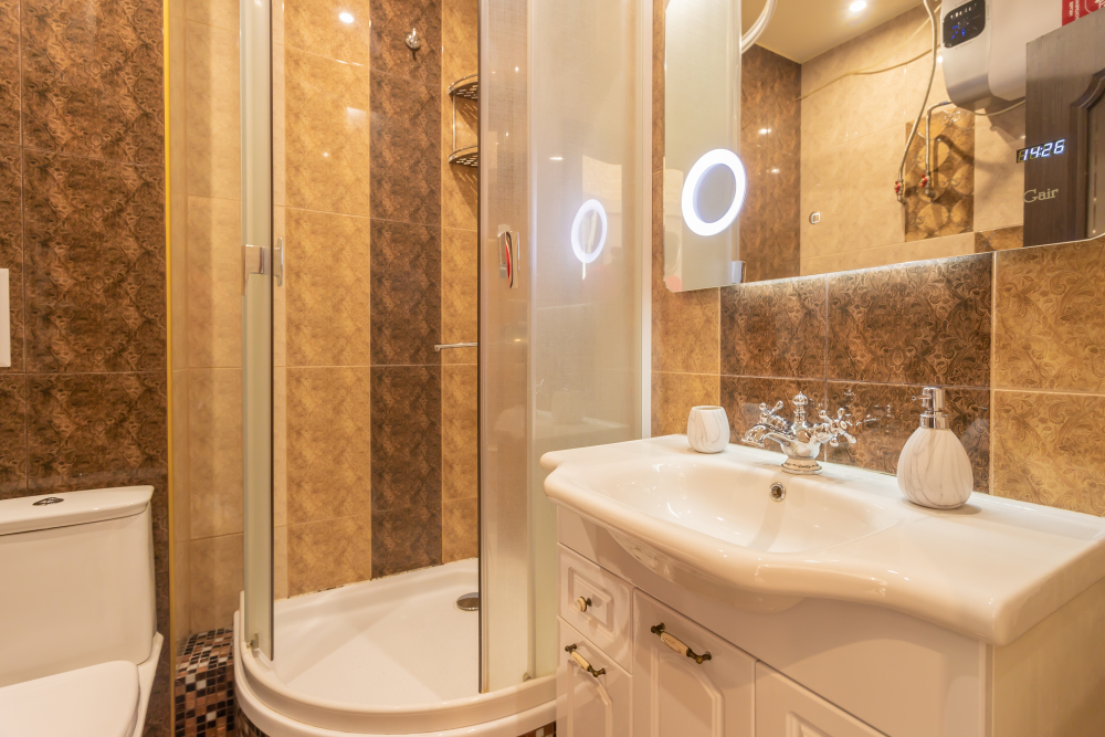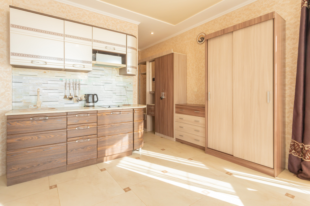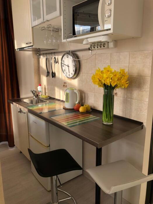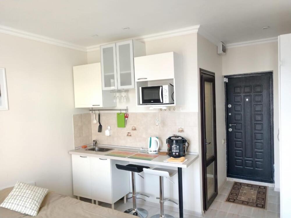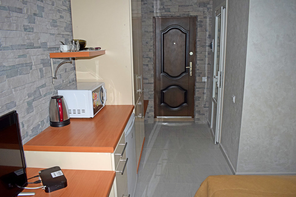 В номере есть барная стойка, мультиварка, микроволновая печь, электрочайник, набор посуды.