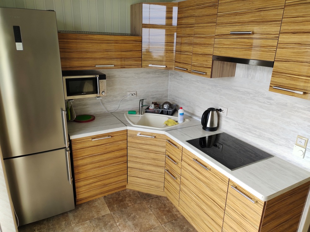 Уютные семейные апартаменты с полноценной кухней. Вид на море и горы. Есть плита, набор посуды, электрочайник, холодильник, стиральная машина, микроволновая печь.