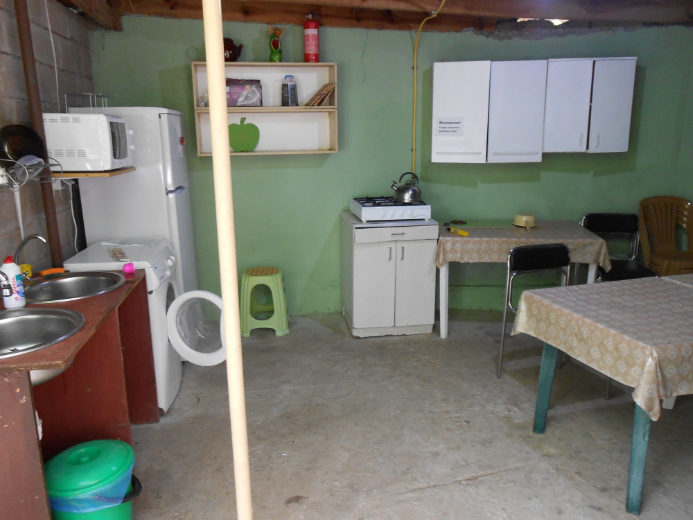 Кухня летняя на два номера, холодильник персональный стоит на кухне.
