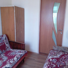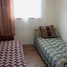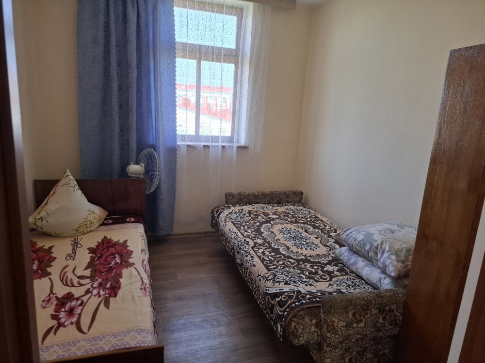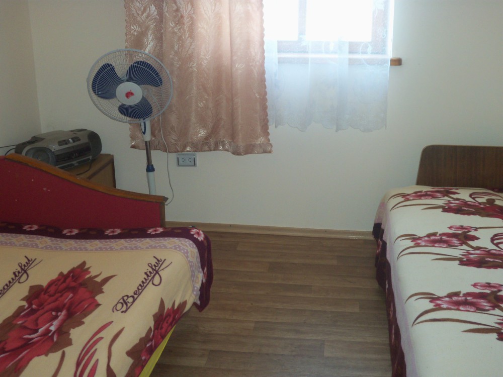 Обустроенный уютный номер, где имеется шкаф, тумбочка, трех скоростной вентилятор, два 1,5 дивана. Необходимая посуда, холодильник. Санузел в номере, душевые комнаты во дворе.