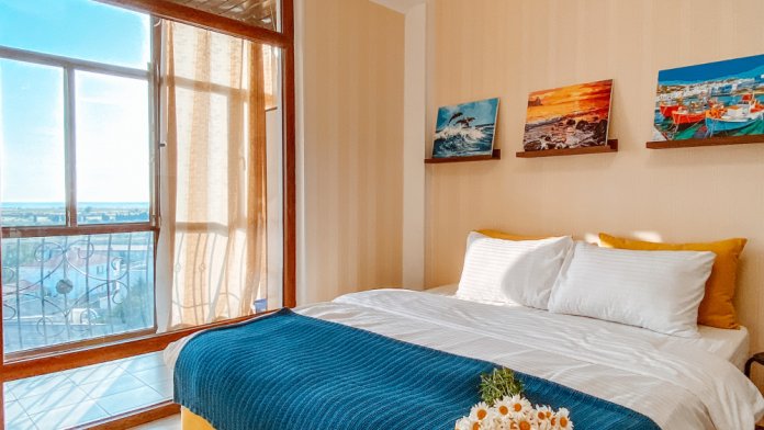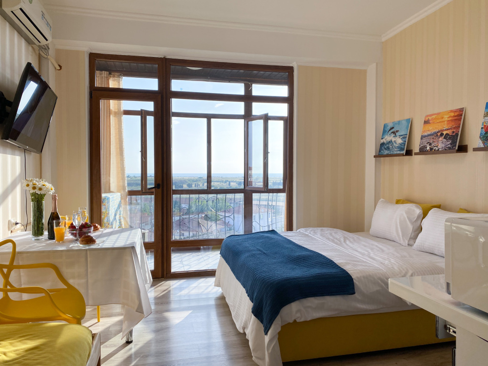 Апартамент у моря с бассейном имеет потрясающий вид на море и закат. Поблизости расположен музей «35 батарея», дикие пляжи и пляж «Голубая бухта». Проезд на машине до аквапарка «Зурбаган» и парка Победы занимает 15 минут.