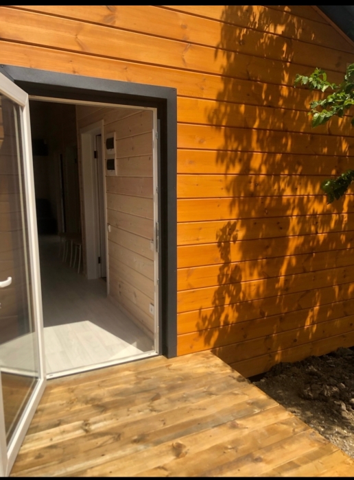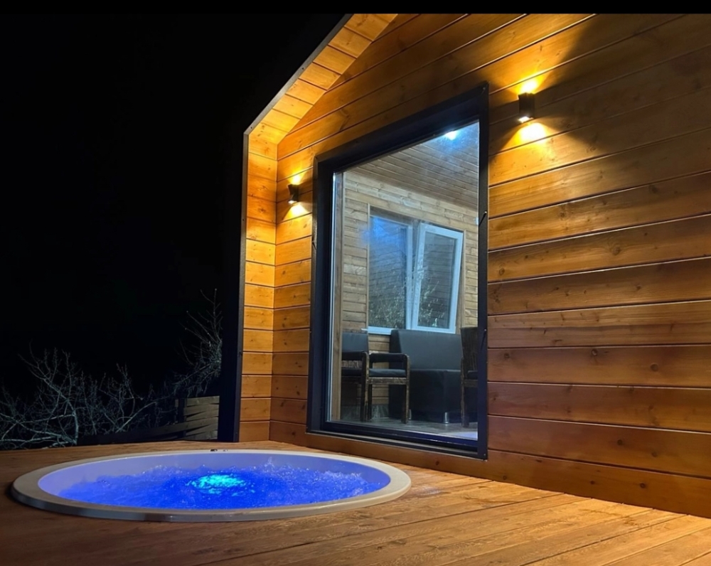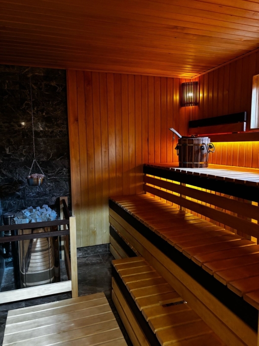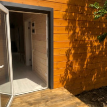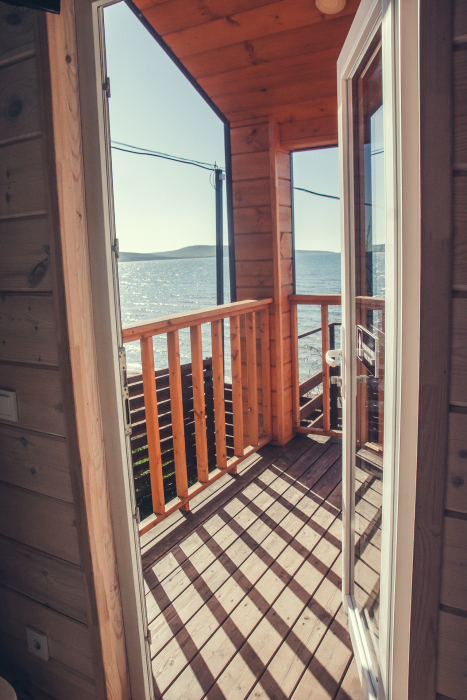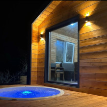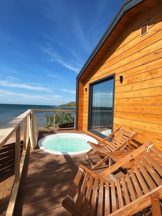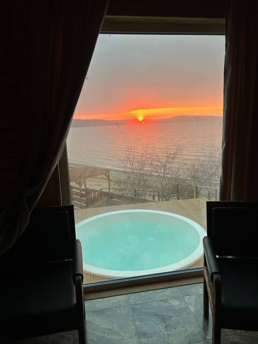 Отдельный видовой коттедж с сауной, большой террасой, на которой расположена горячая купель с джакузи и собственным выходом к морю. Сауна и купель оплачиваются отдельно.