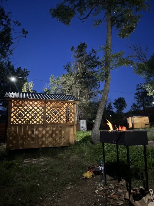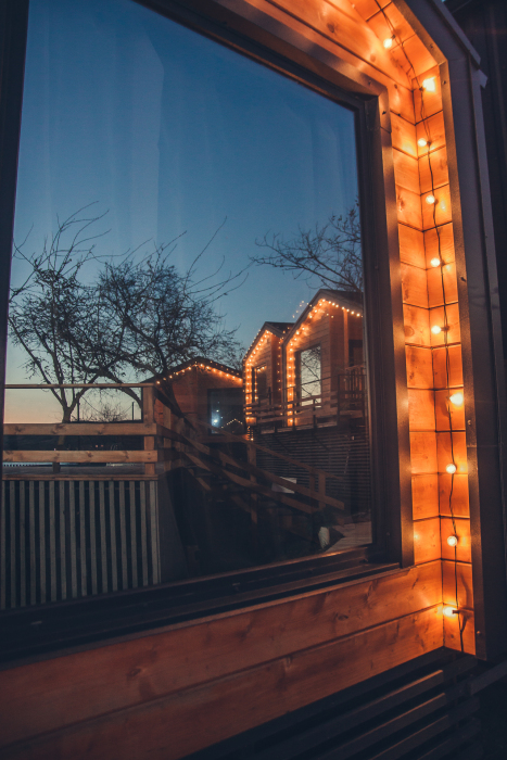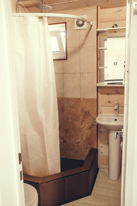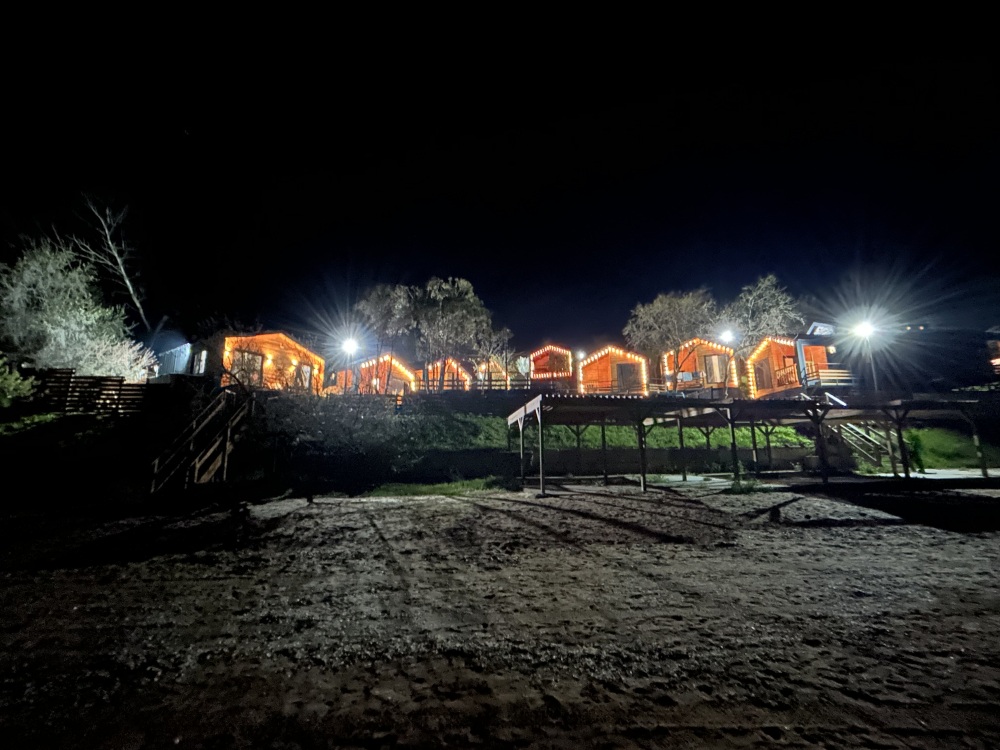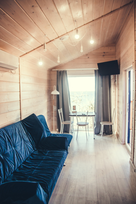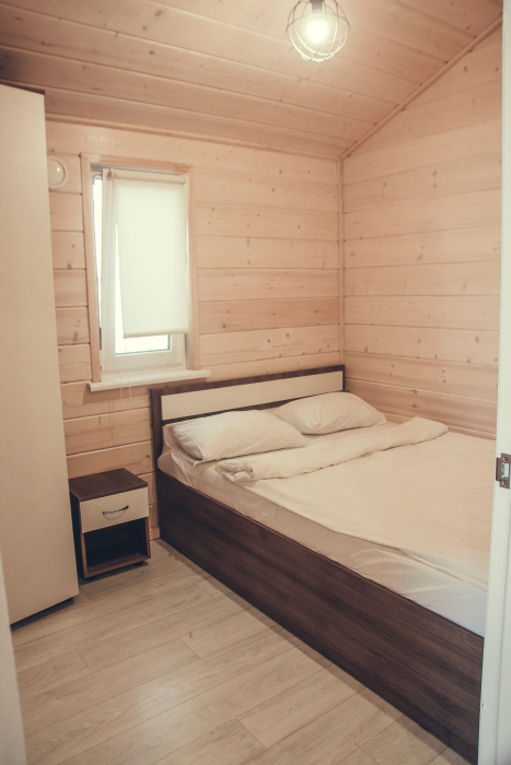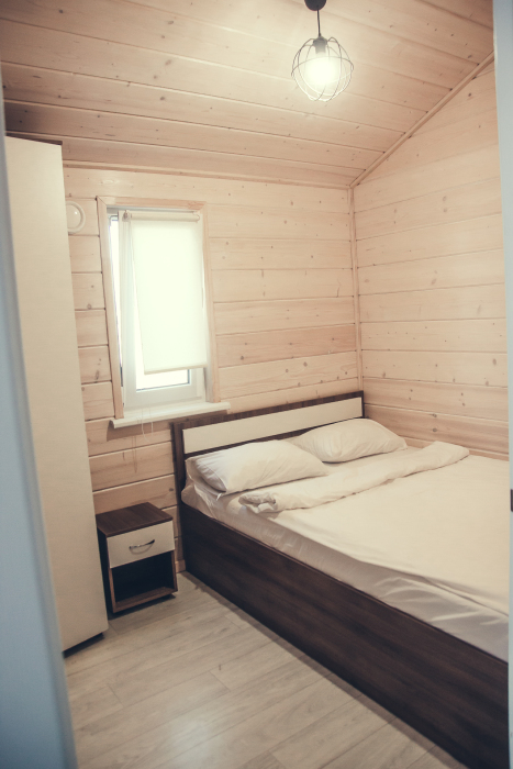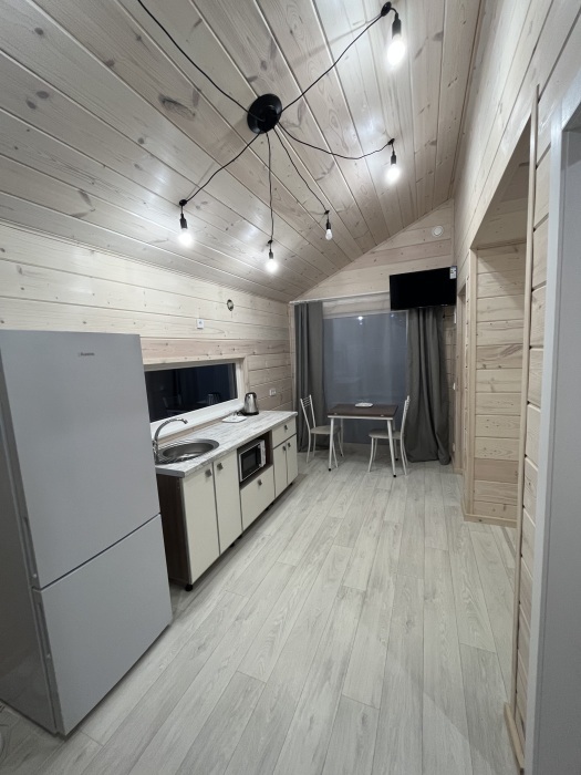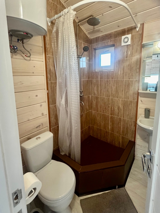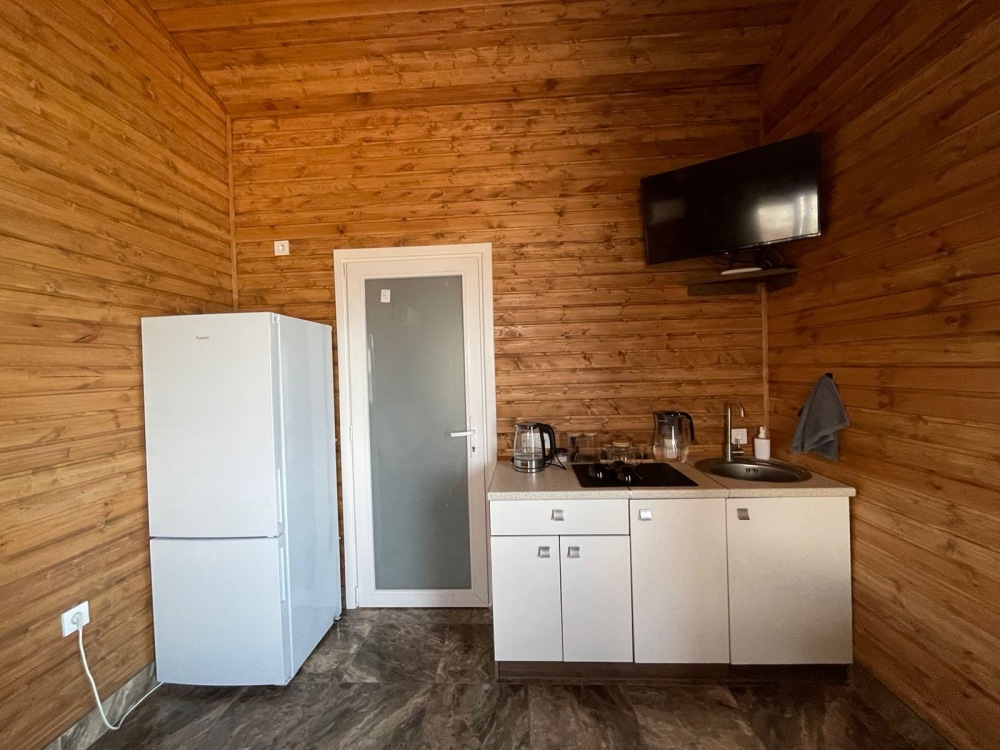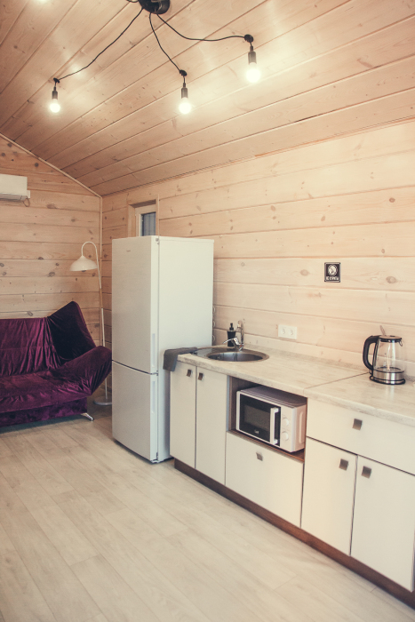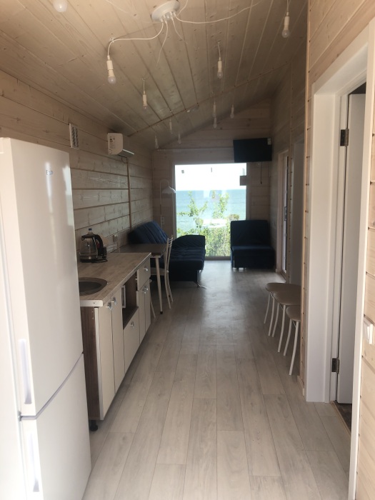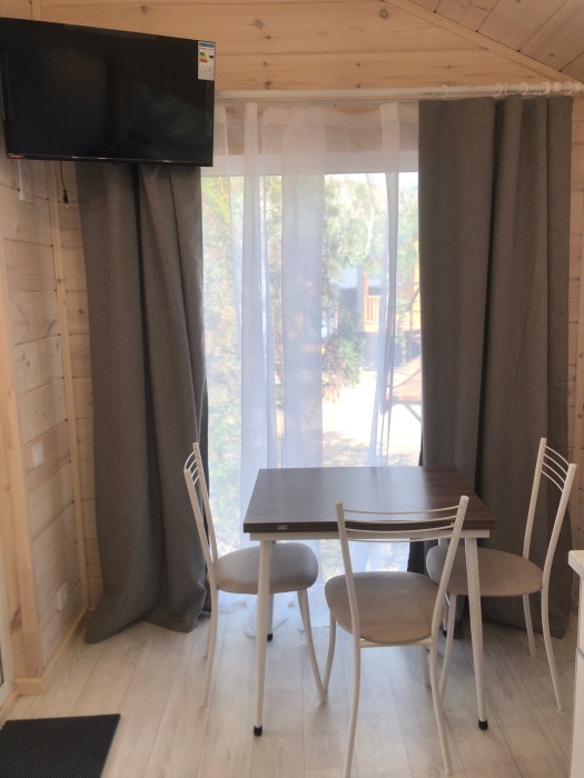 В каждом домике есть терраса, кондиционер, плазма, мини-кухня (холодильник, микроволновка, столешница с встроенной раковиной ), чайник, посуда, переносной стол и стулья, шкаф для вещей, гардеробная, постельное и полотенца.