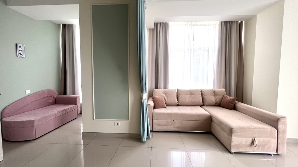 1 двуспальная кровать, 1 диван-кровать, детская кроватка (по запросу)