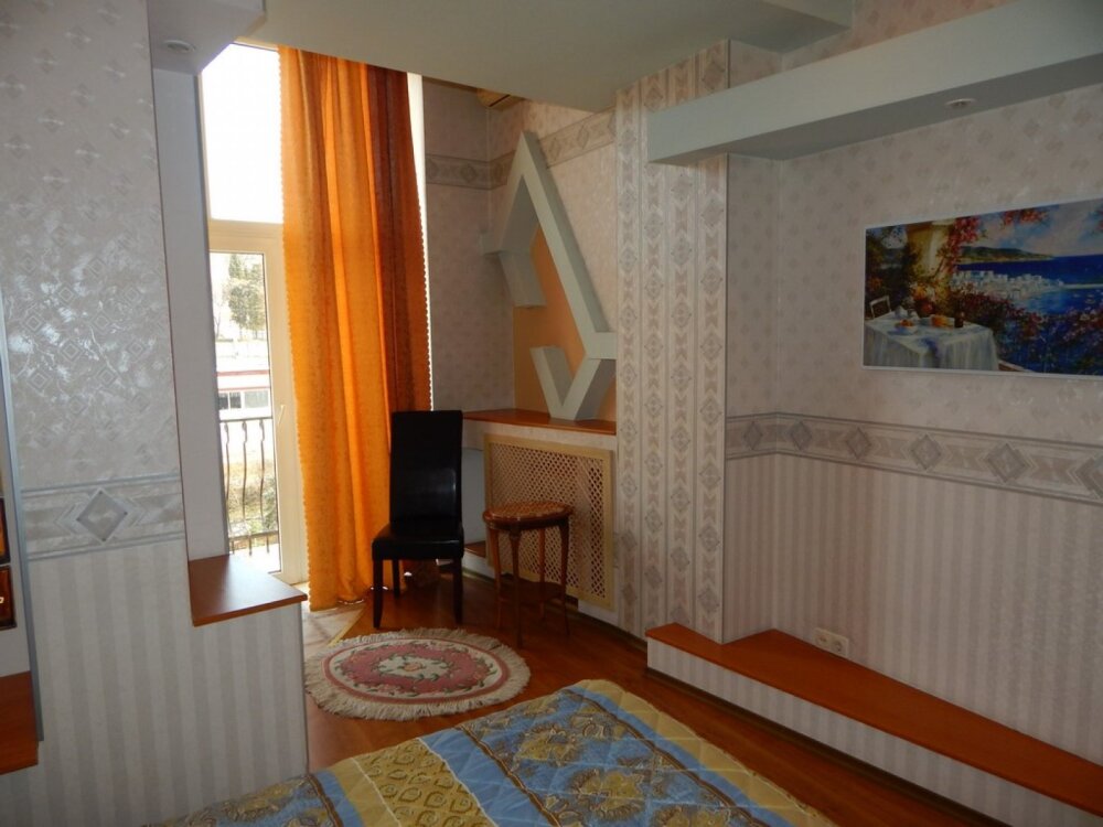 В апартаментах две спальные комнаты. В каждой комнате есть балкон, откуда открывается прекрасный панорамный вид на город, море, восход солнца, салют. Большая двуспальная кровать в каждой спальне. Мягкий раскладной диван с уютными креслами в комнате для гостей. Холодная, горячая вода постоянно.